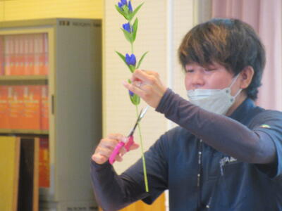 教わったことを生かしながら、花を切って、いけていきます。大きさや色のバランスも大事ですね。