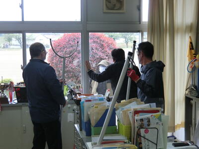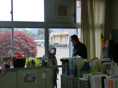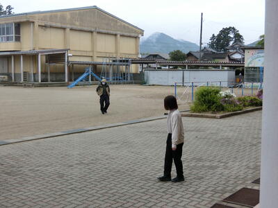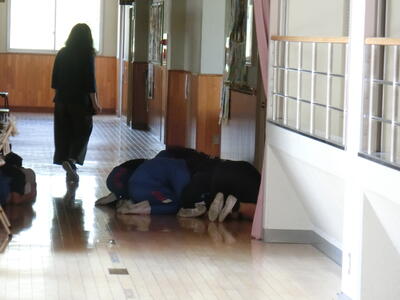 もし校庭にいたら、建物から離れて見通しのいい場所で身を低くして頭を守るようにします。様々な場所で訓練をしました。