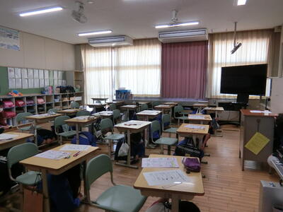 教室では窓を閉め、カーテンも閉め、机の下に避難して頭を守ります。