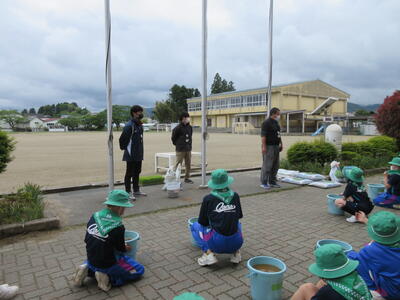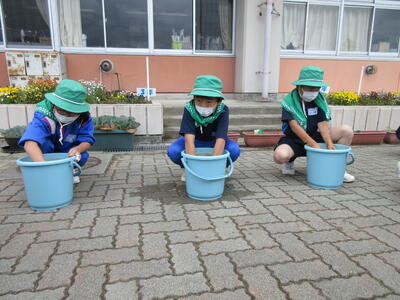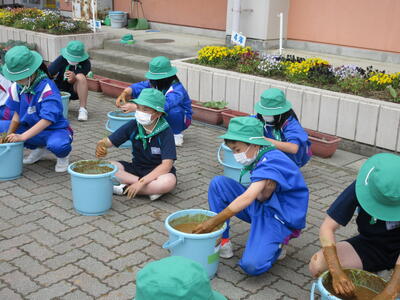 5年生は社会科の学習の一環で、バケツで稲を育てます。