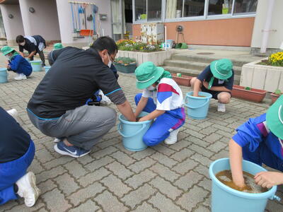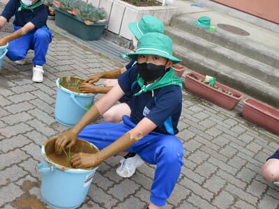 バケツに水を張ったら、泥をこねます。いわゆる「代掻き」にあたる作業です。