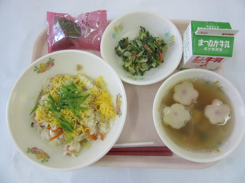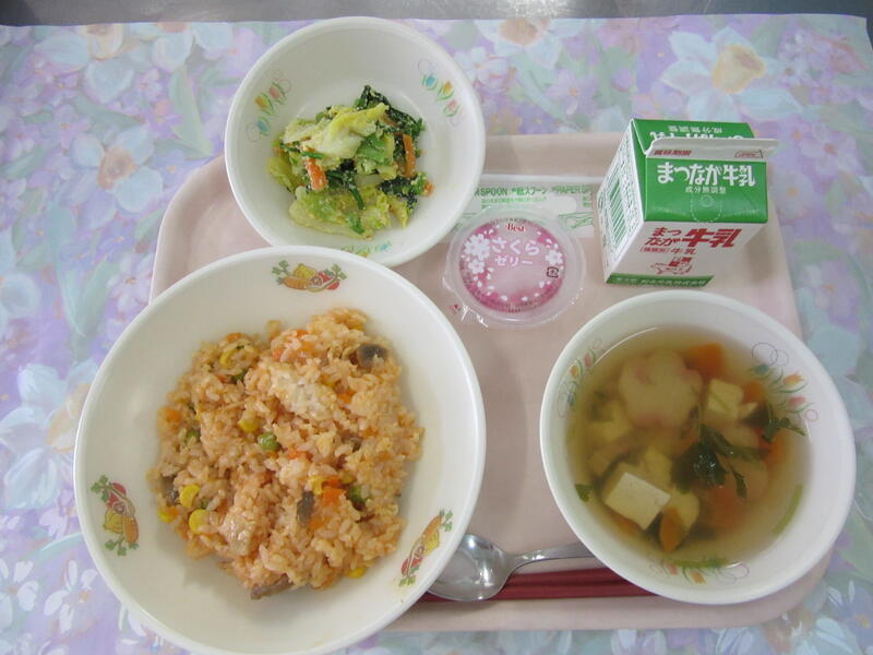 4月11日(火)チキンライス、牛乳、菜の花和え、すまし汁、さくらゼリー☆お花見献立