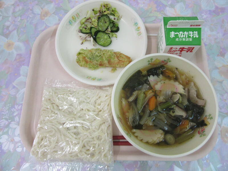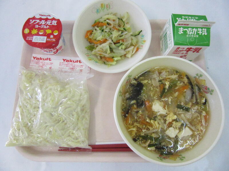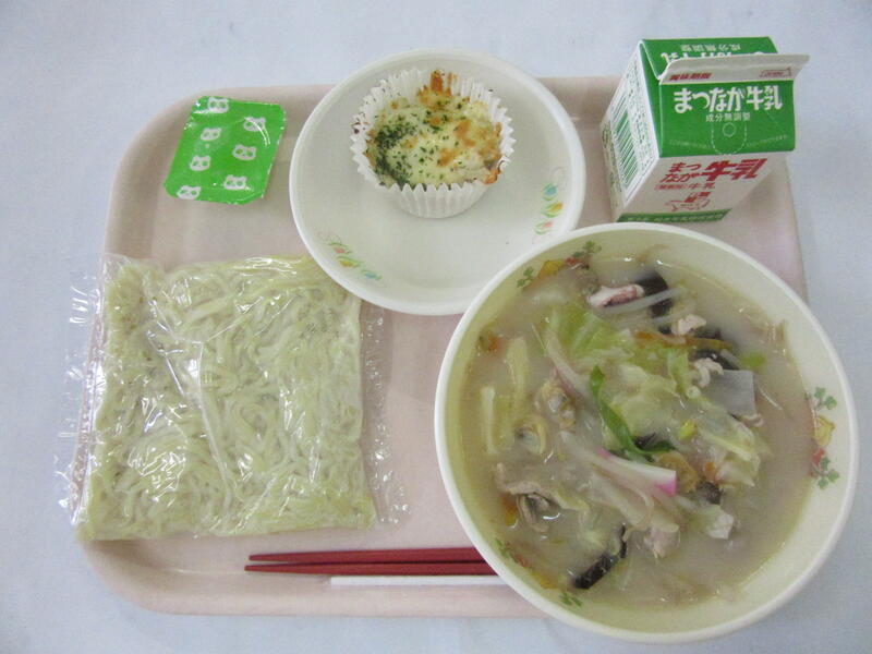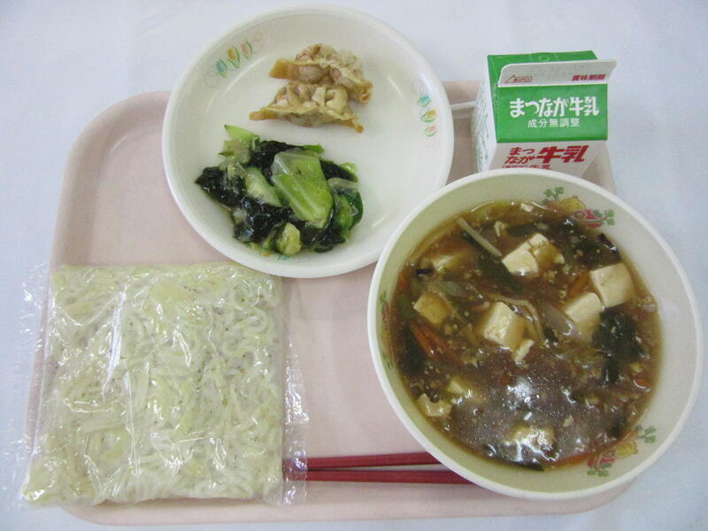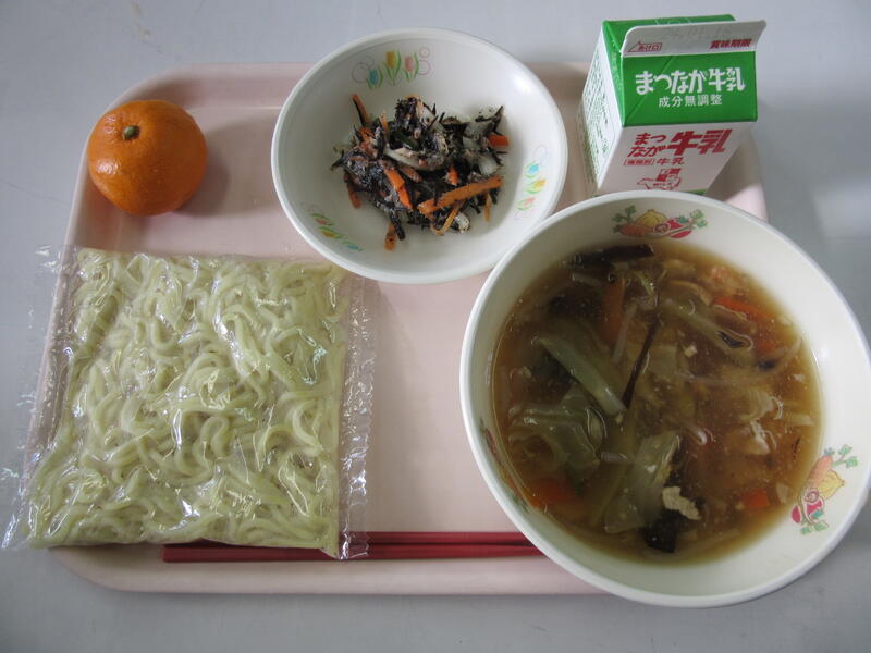 6月14日(水)ちゃんぽん麺、牛乳、小松菜とひじきのナムル、一口ゼリー