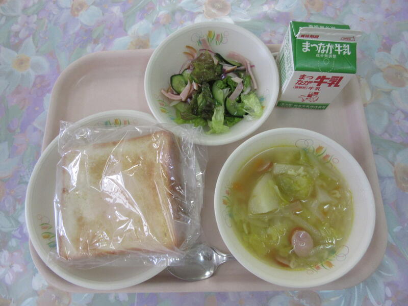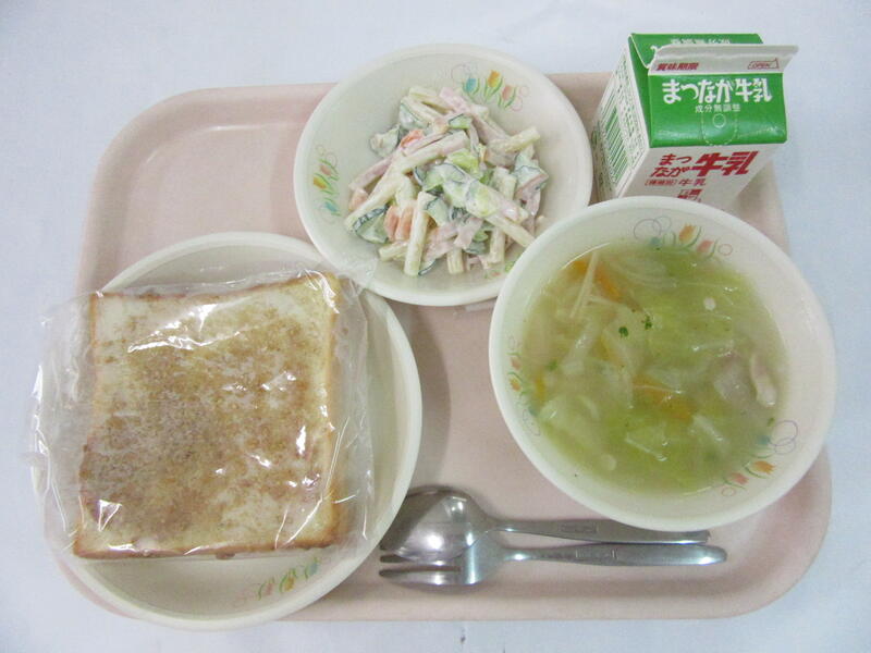 4月13日(木)シュガートースト、牛乳、ハムマリネサラダ、アルファベットスープ