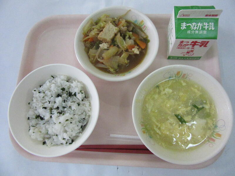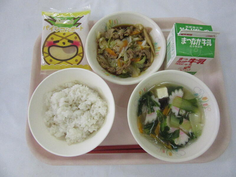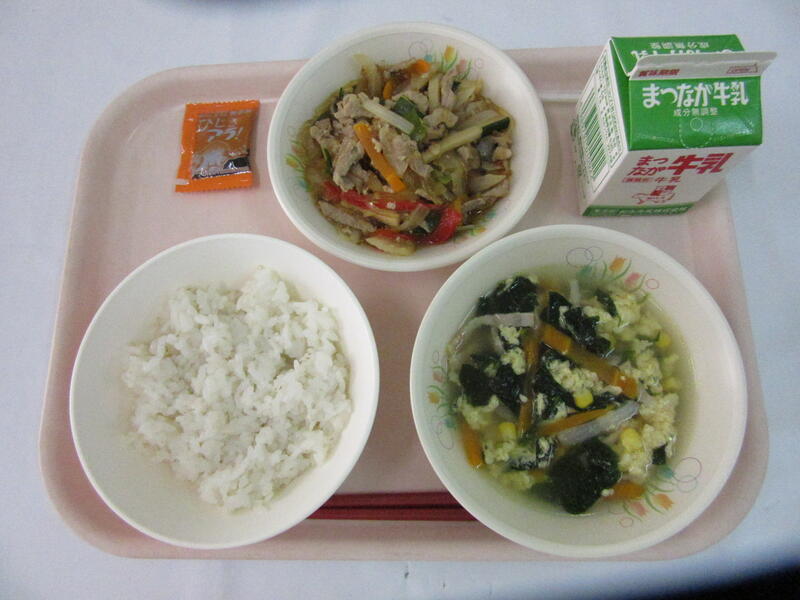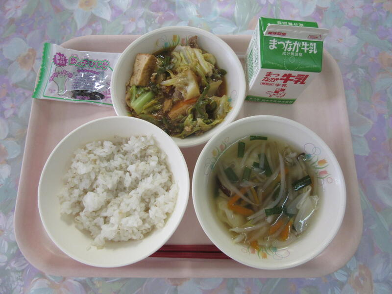 麦ごはん、鉄っこひじき、牛乳、回鍋肉、ワンタンスープ