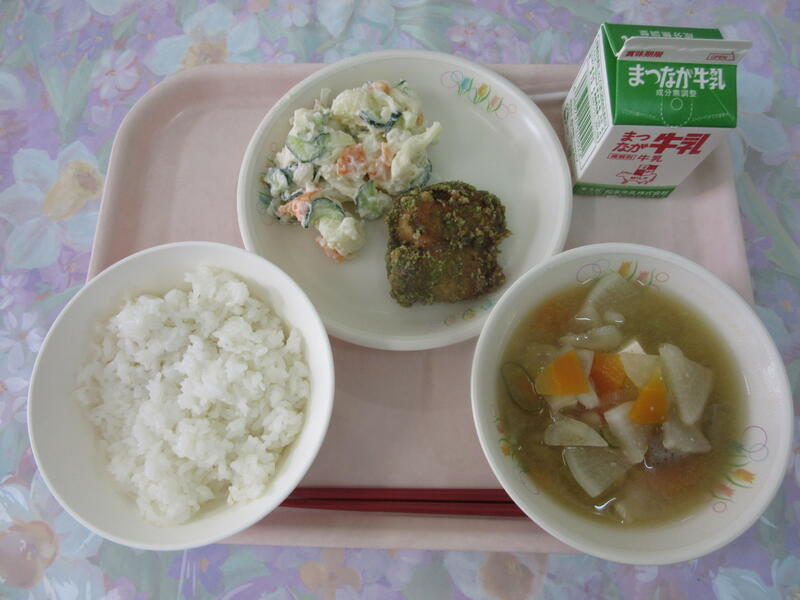 4月18日(火)ごはん、赤魚の青葉揚げ、ポテトサラダ、具たくさんみそ汁☆日本型食生活献立