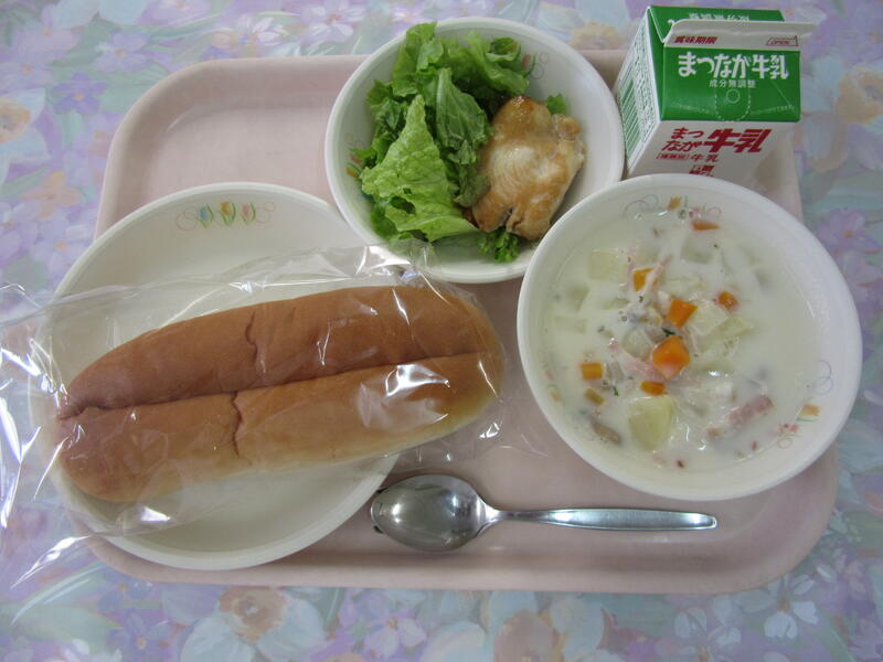 4月20日(木)コッペパン、セルフ照り焼きチキン、添えレタス、牛乳、クラムチャウダー