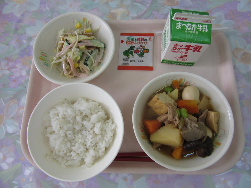 4月21日(金)麦ごはん、牛乳、野菜と噛むふりかけ、じゃがいものうま煮、かみかみサラダ、