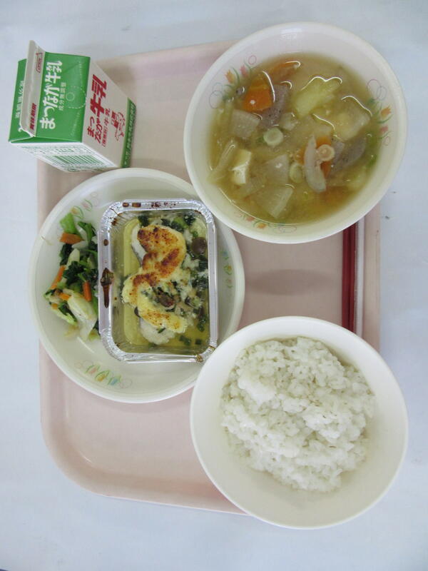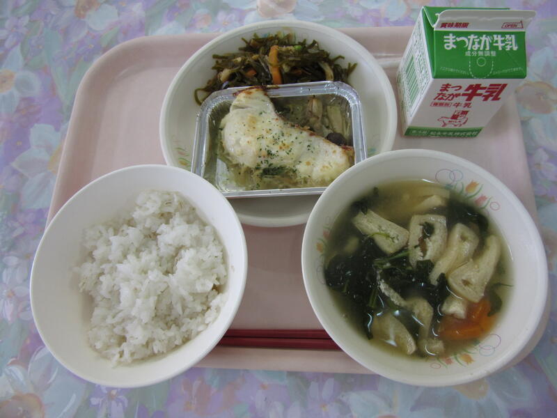 4月24日(月)麦ごはん、牛乳、白身魚のマヨネーズ焼き、切り昆布の炒め煮、小松菜のみそ汁