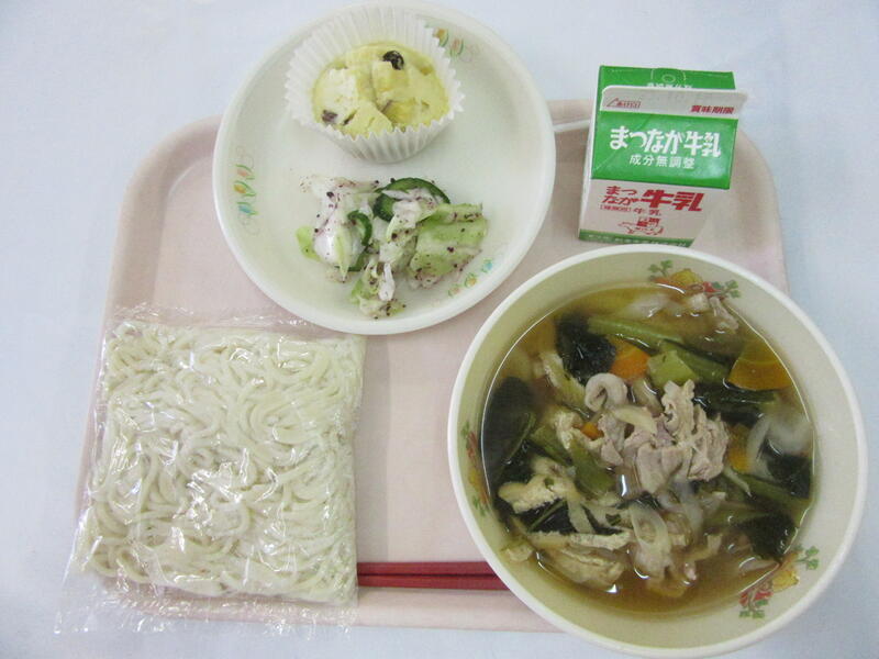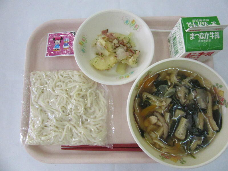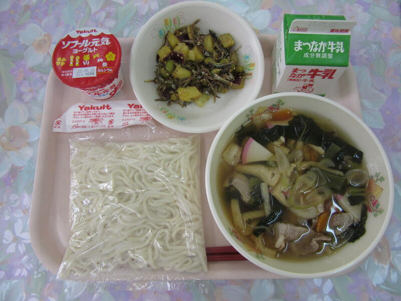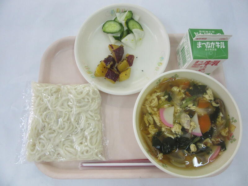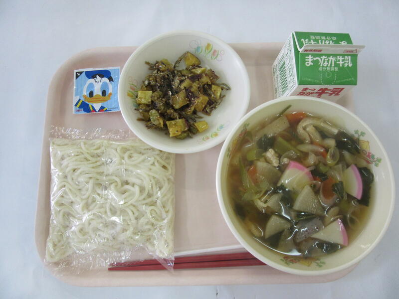 4月26日(水)五目うどん、牛乳、さつまいもと煮干しの揚げ煮、ヨーグルト