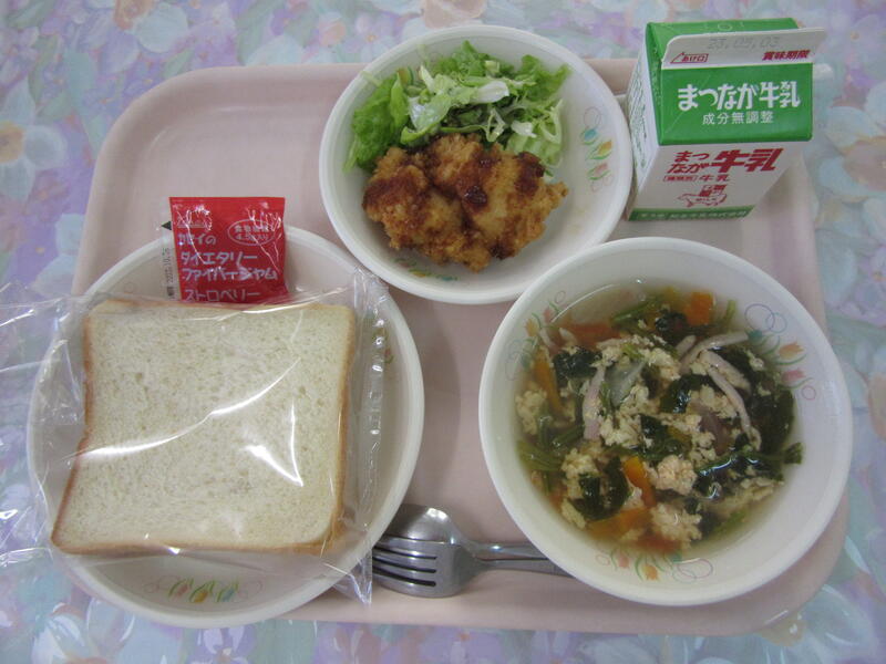 4月27日(木)食パン、いちごジャム、牛乳、チキンカツ、添え野菜、イタリアンスープ