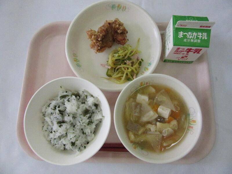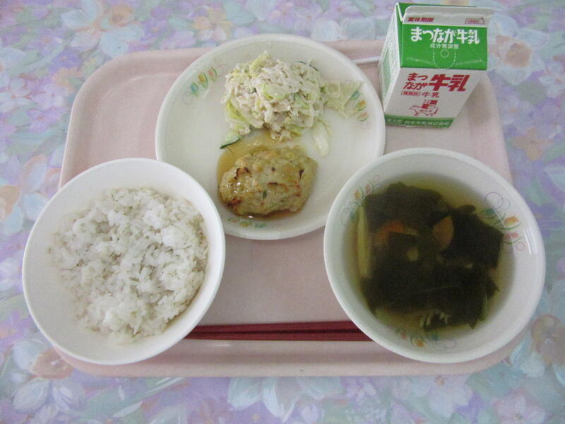 5月1日(月)ごはん、牛乳、かみかみつくね、切干大根のゴマネーズ和え、若竹汁