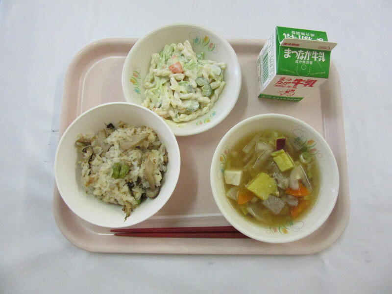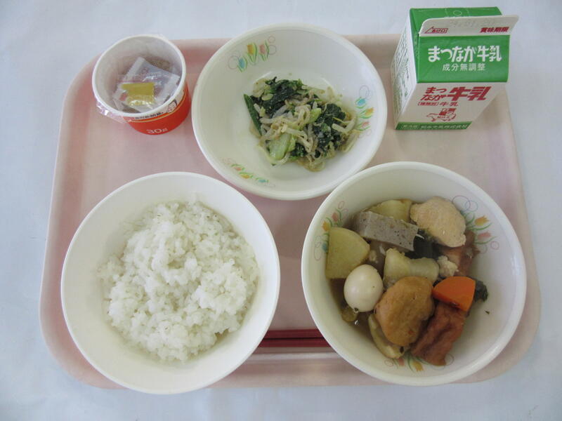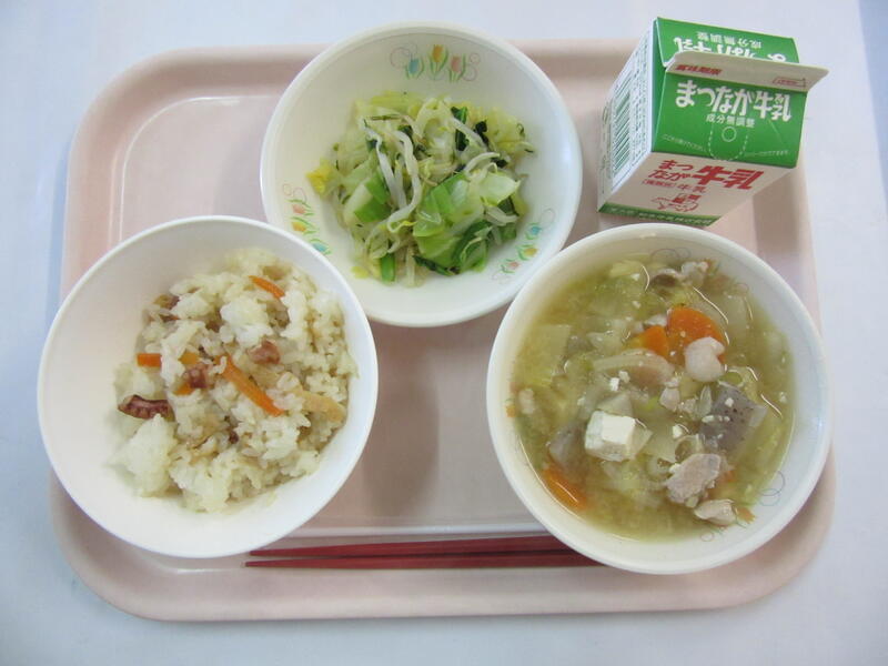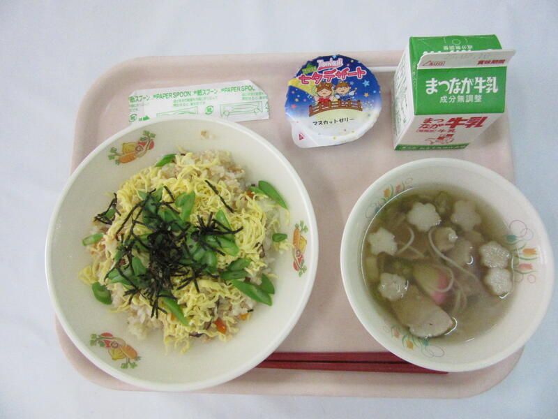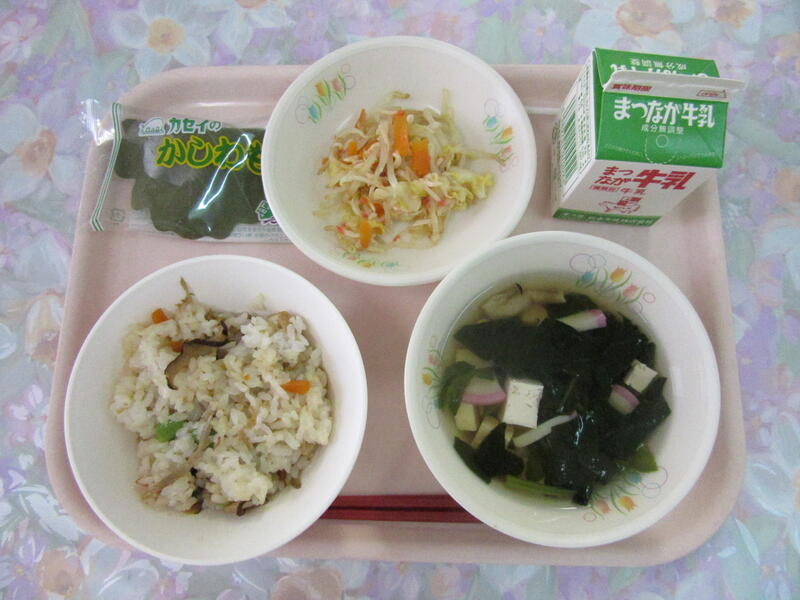 5月2日(火)鶏五目ごはん、牛乳、からしあえ、すまし汁、かしわもち
