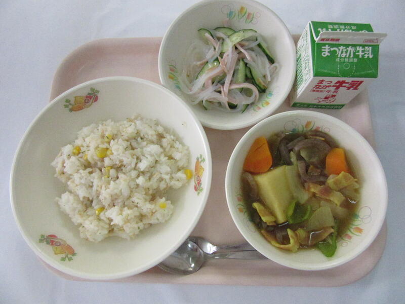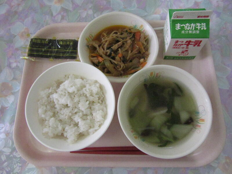 6月26日(月)麦ごはん、牛乳、チャプチェ、ふわふわ卵スープ、佃煮