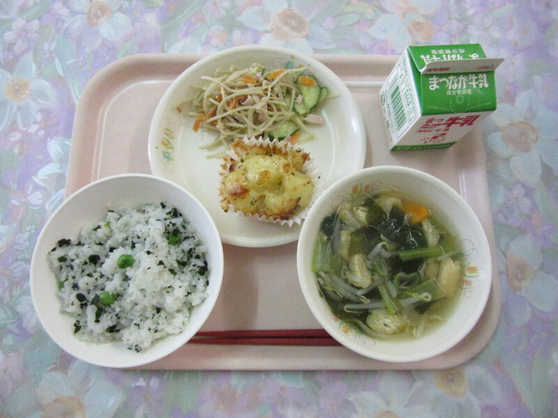 5月9日(火)ピースごはん、牛乳、じゃがいものチーズ焼き、ごぼうサラダ、小松菜のみそ汁