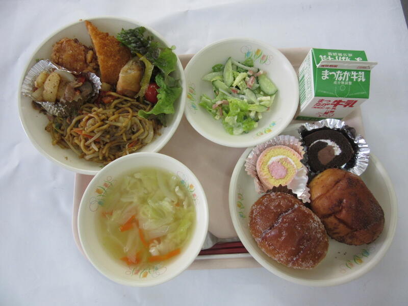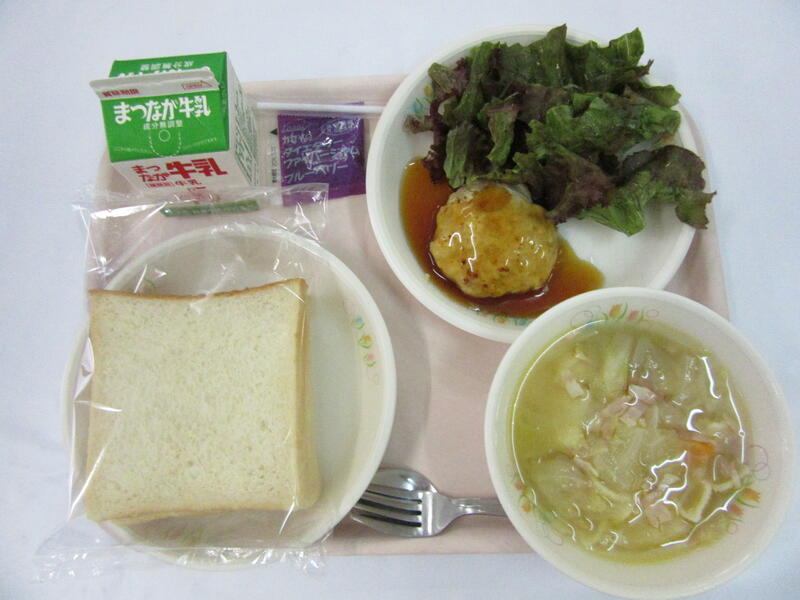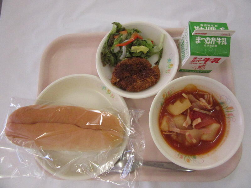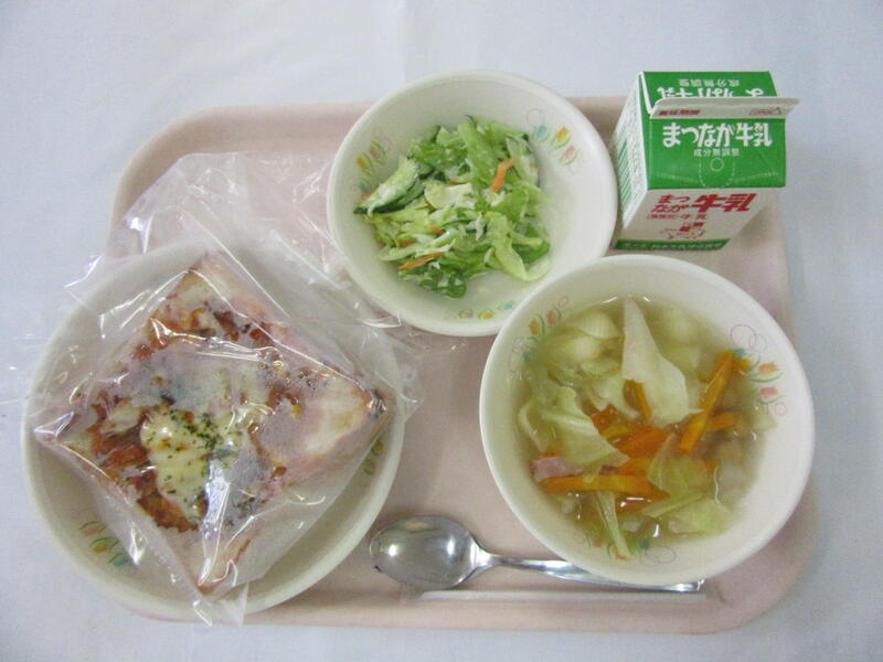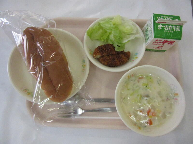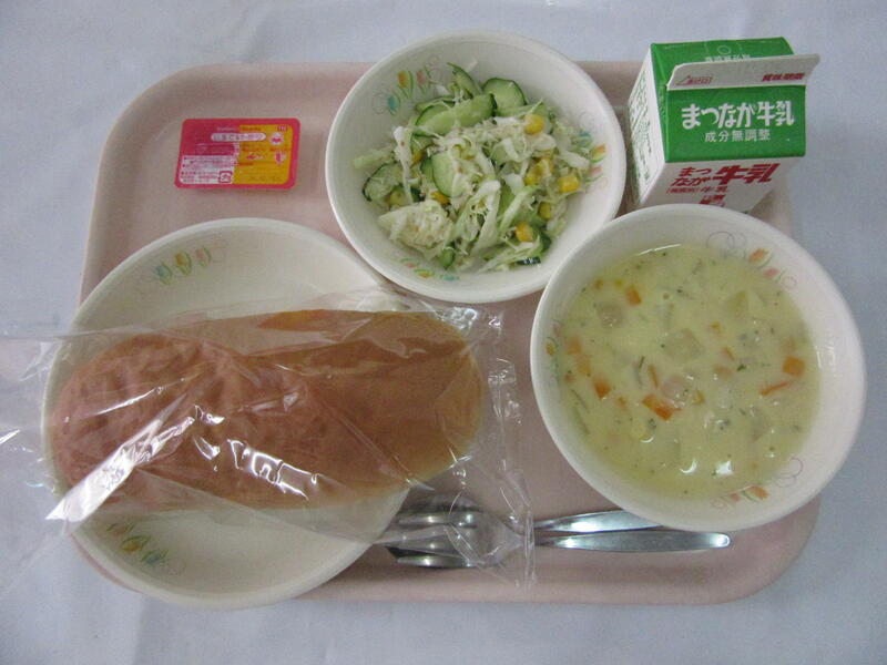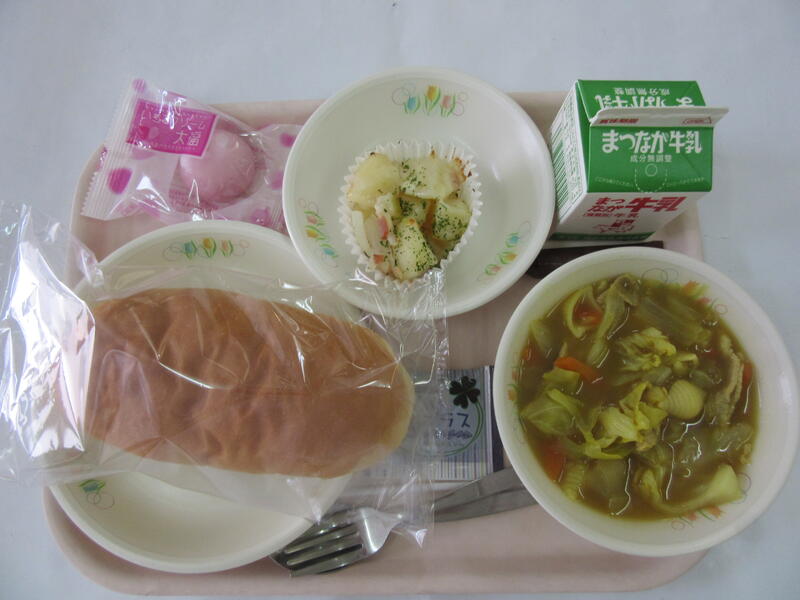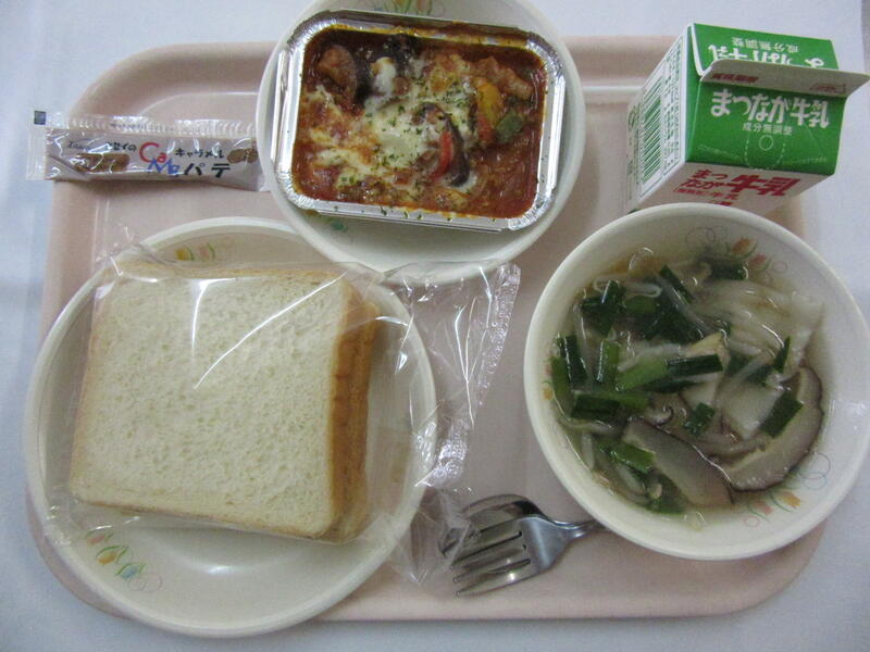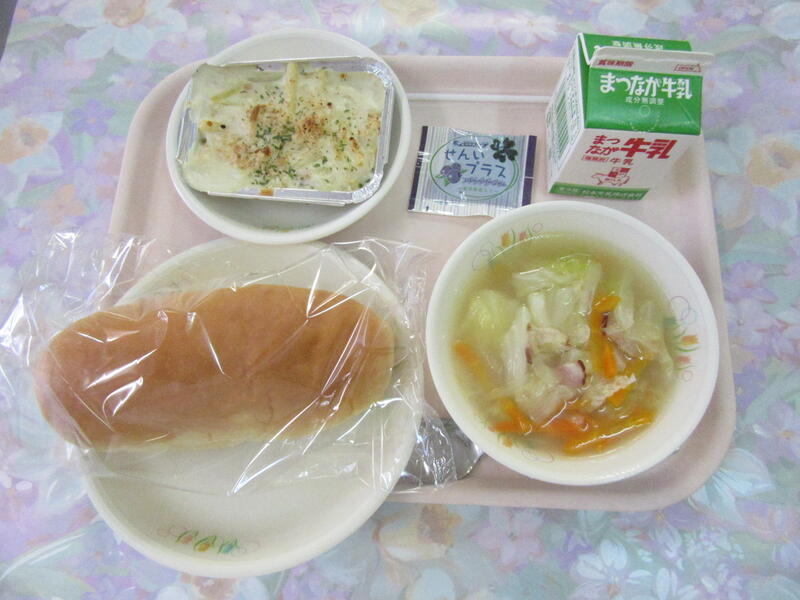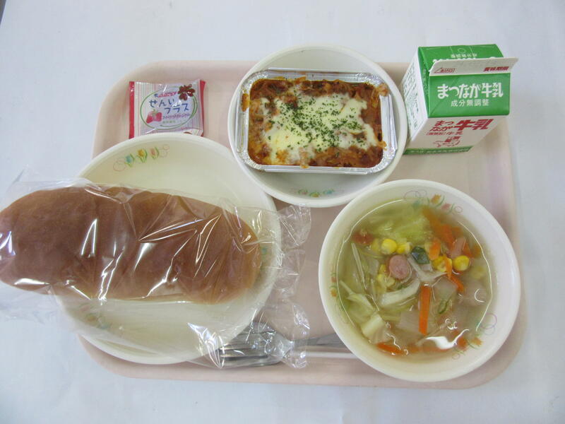 5月11日 コッペパン、ブルーベリージャム、牛乳、マカロニグラタン、野菜スープ