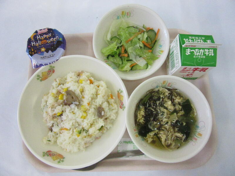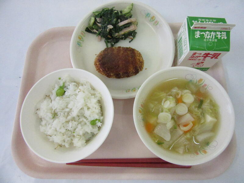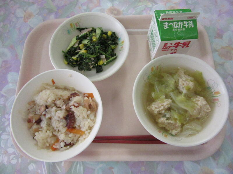 5月16日(火)たこ飯、牛乳、ポパイサラダ、肉団子スープ