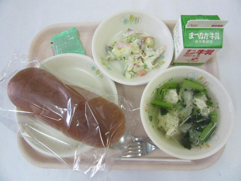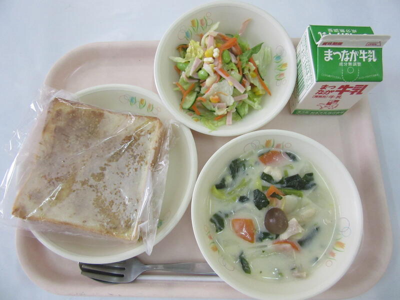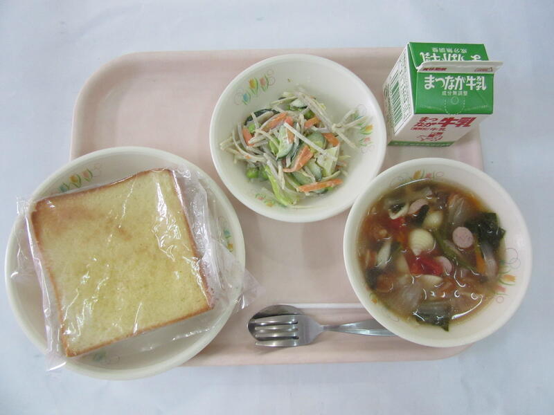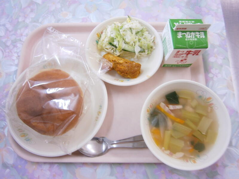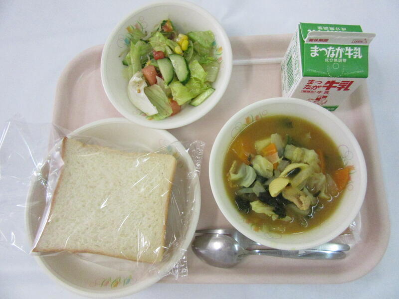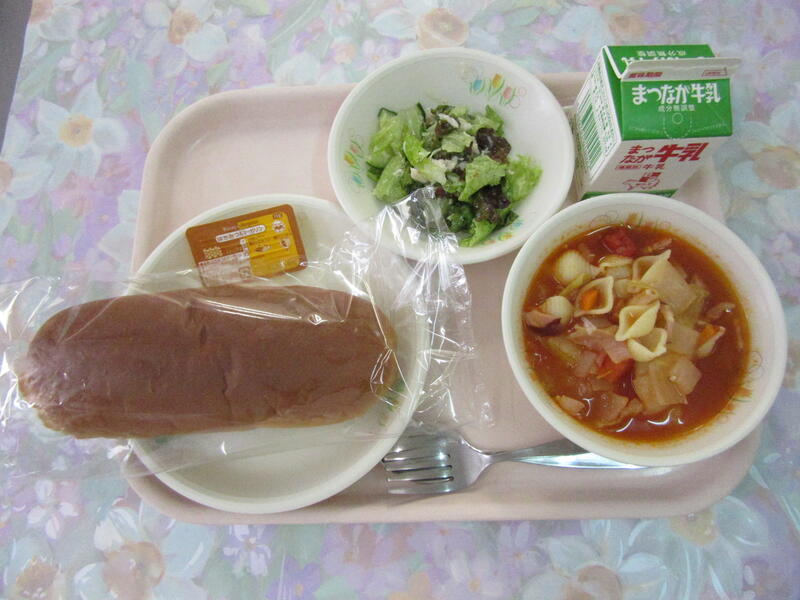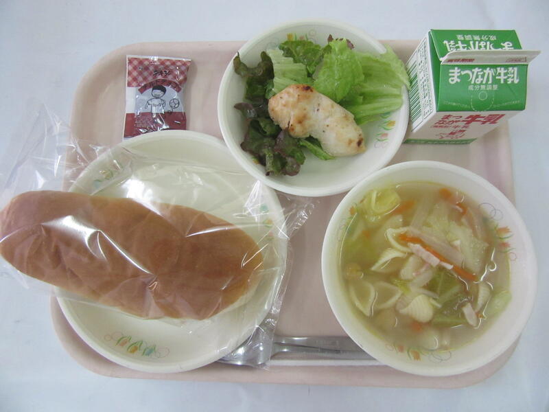 5月18日(木)黒糖コッペパン、牛乳、はちみつ&マーガリン、レタスとチキンのサラダ、ミネストローネ