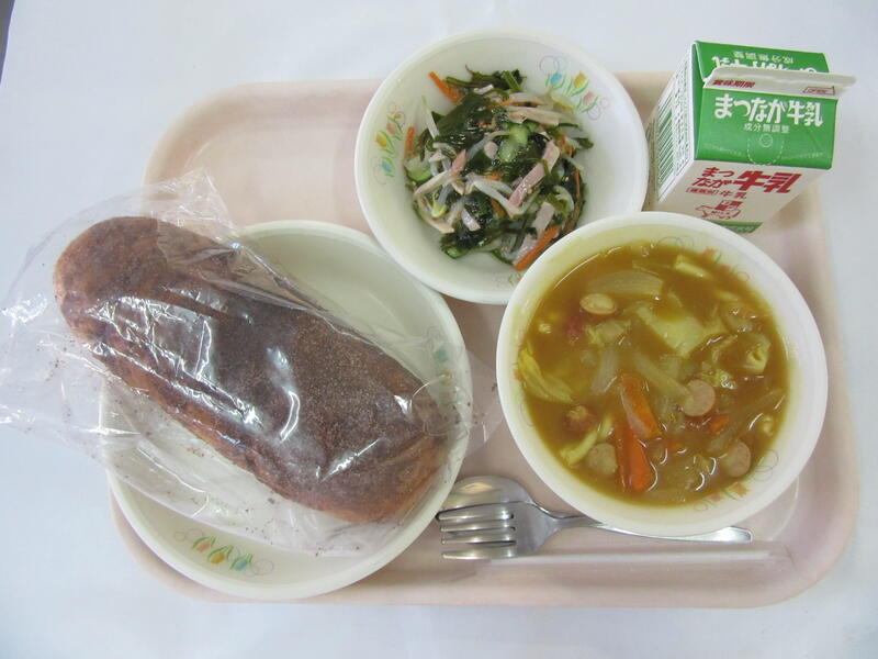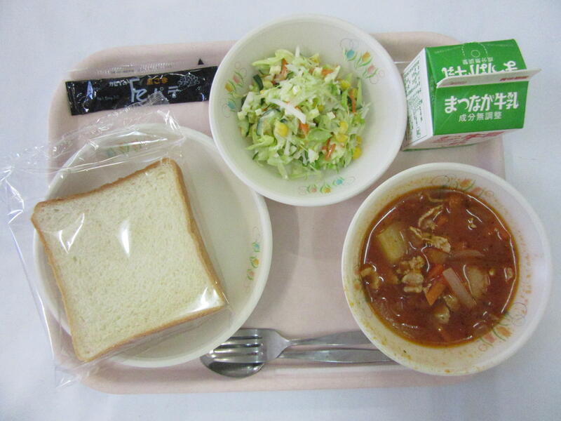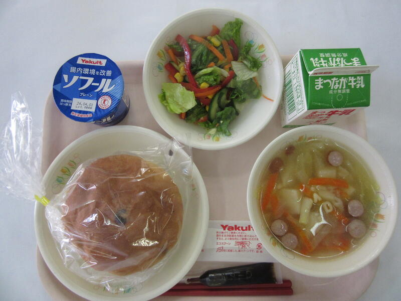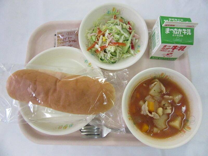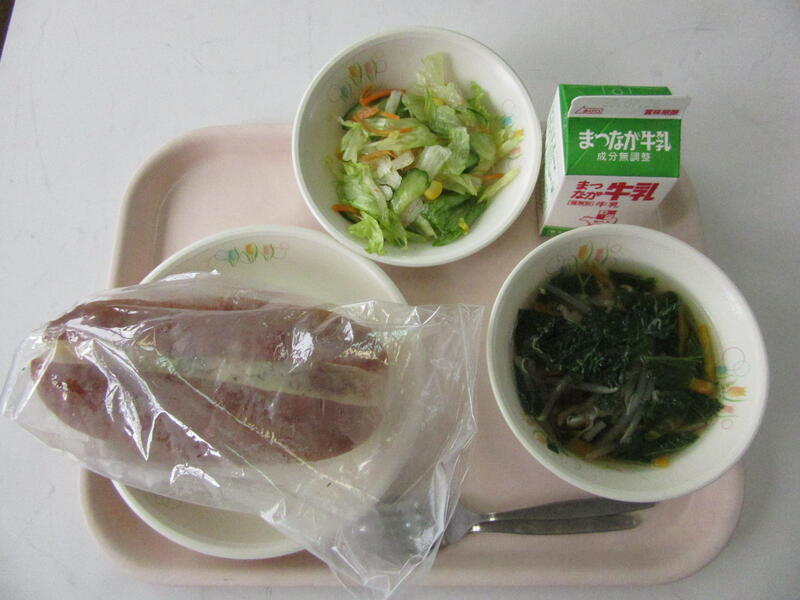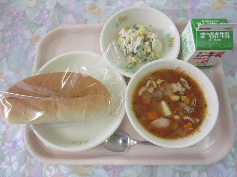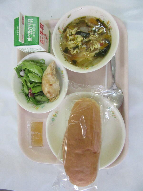 5月18日(木)黒糖コッペパン、牛乳、はちみつ&マーガリン、レタスとチキンのサラダ、ミネストローネ