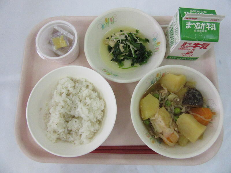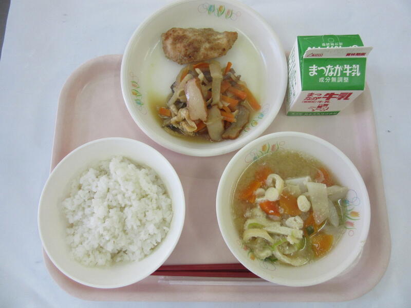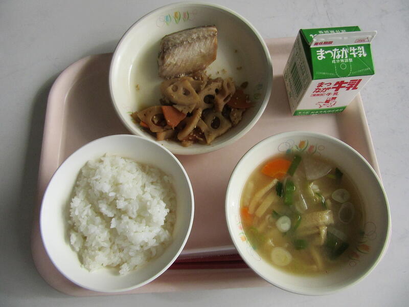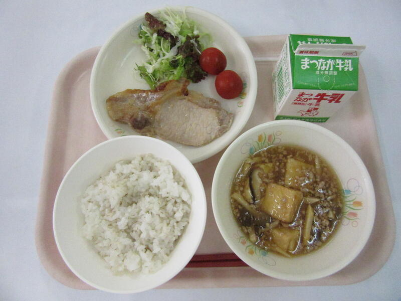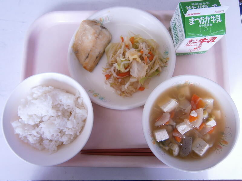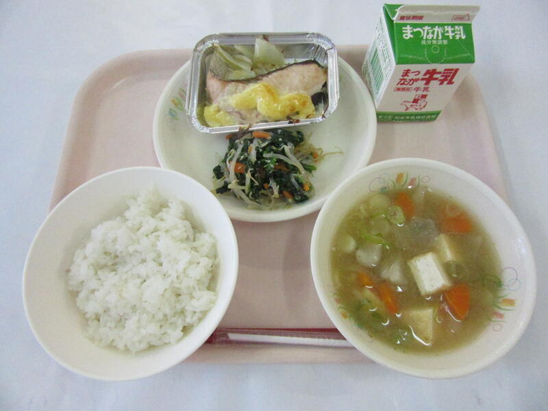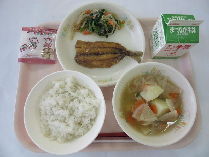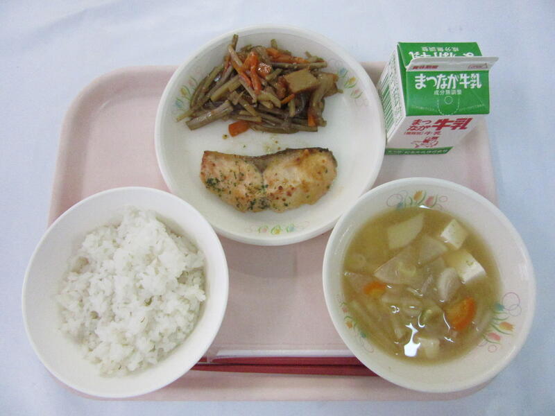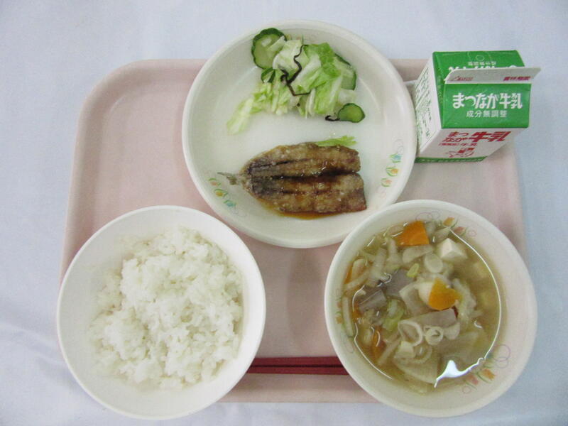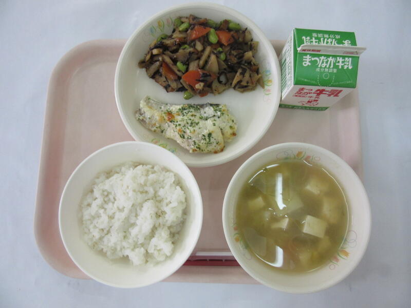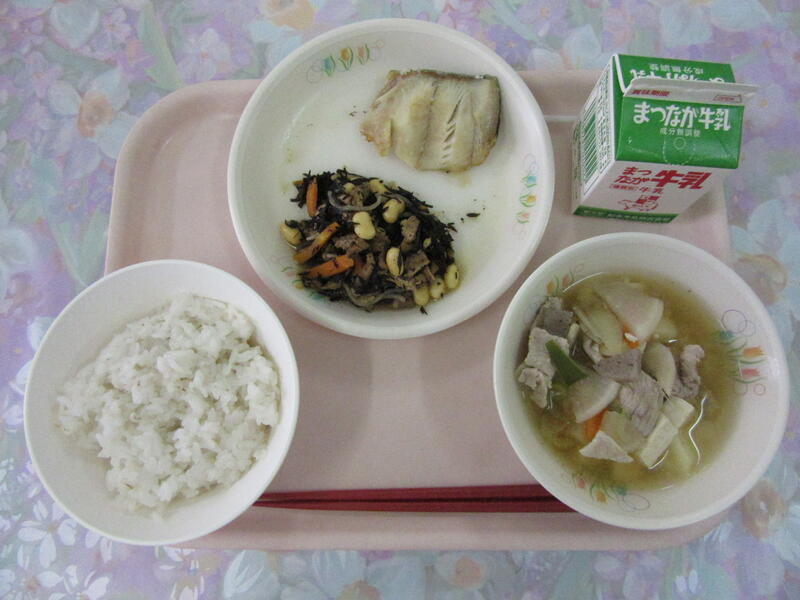 5月19日(金)麦ごはん、牛乳、ほっけの塩焼き、ひじきの煮物、豚汁