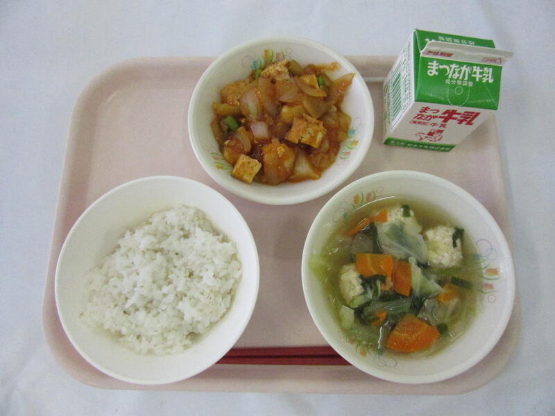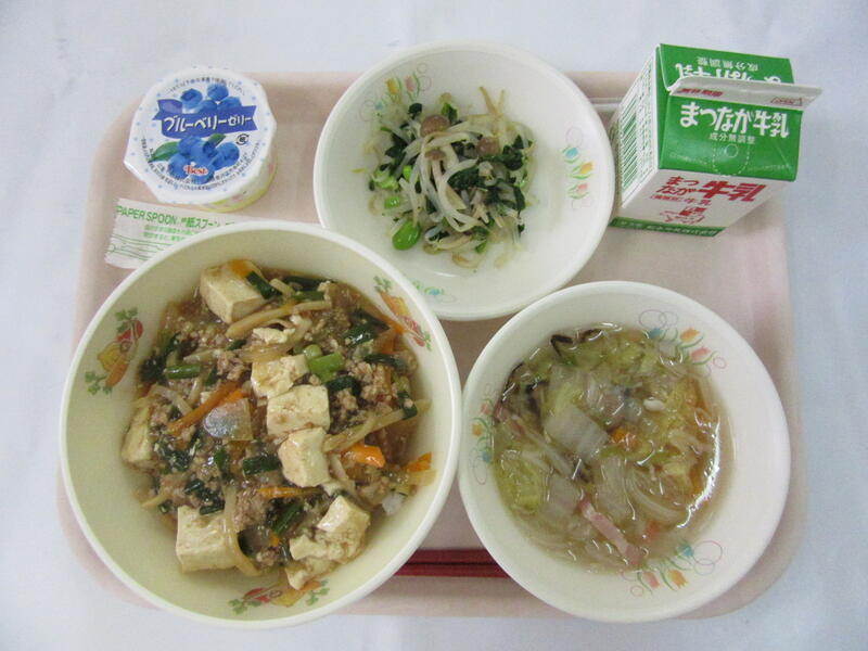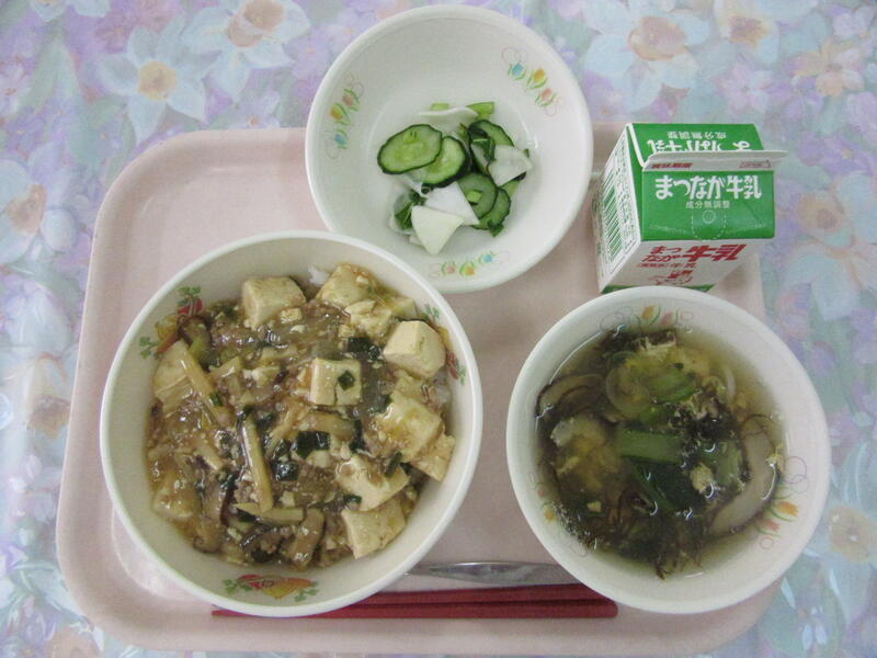 5月23日(火)マーボー丼、牛乳、かぶときゅうりの浅漬け、もずくスープ