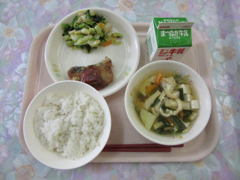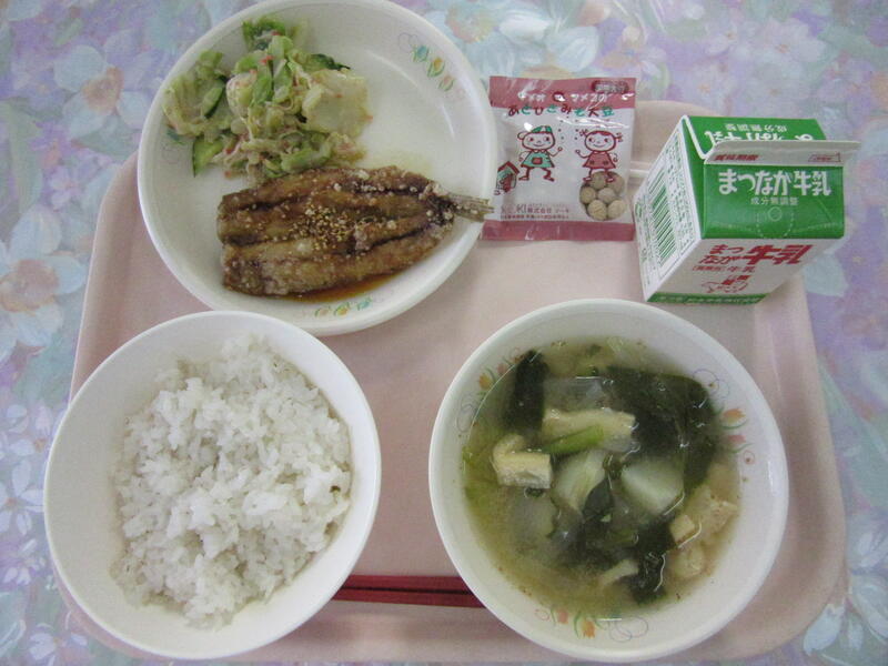 6月5日(月)麦ごはん、牛乳、いわしの蒲焼き、ごま酢和え、新玉ねぎのみそ汁、あとひきみそ大豆