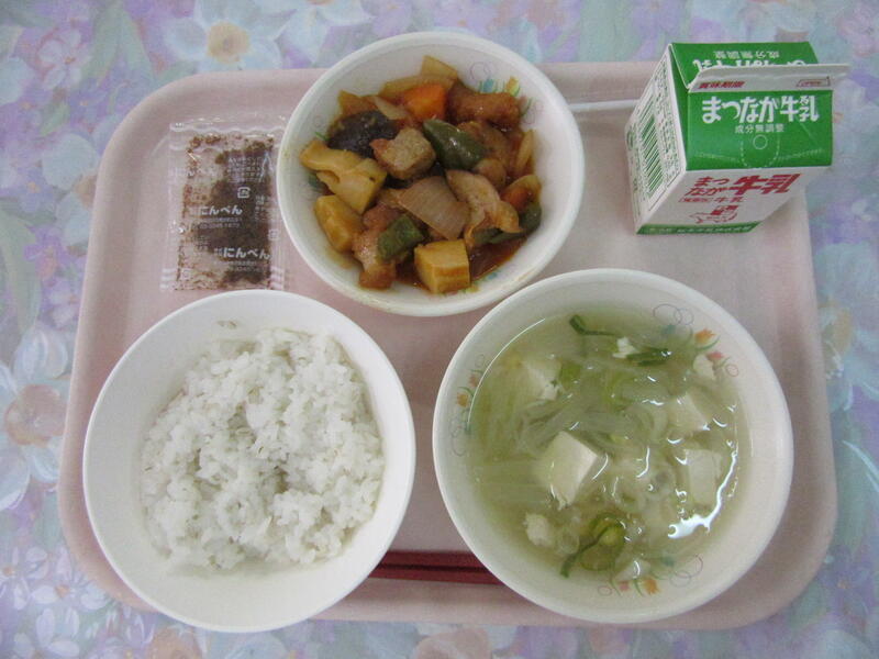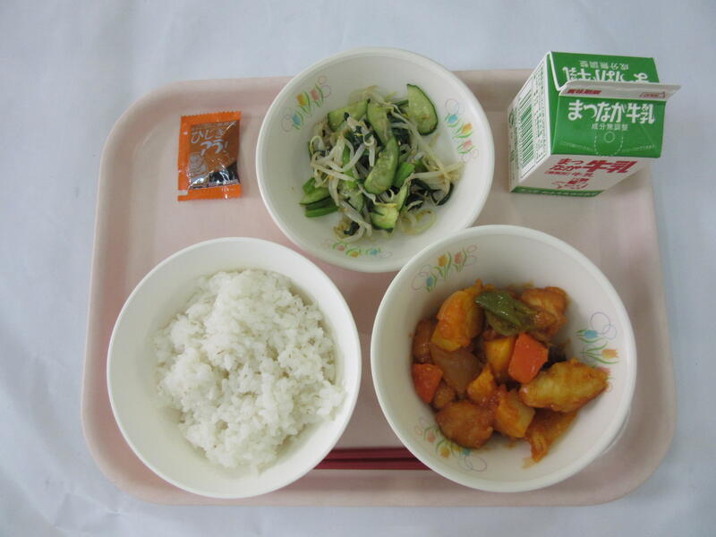 5月29日(月)麦ごはん、おかかふりかけ、牛乳、酢豚、中華スープ