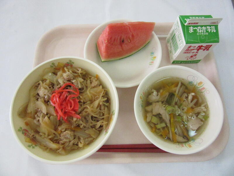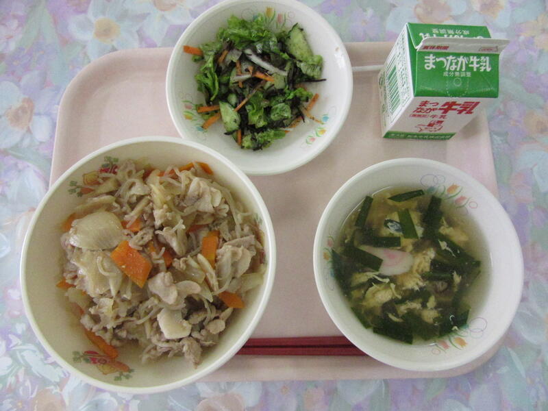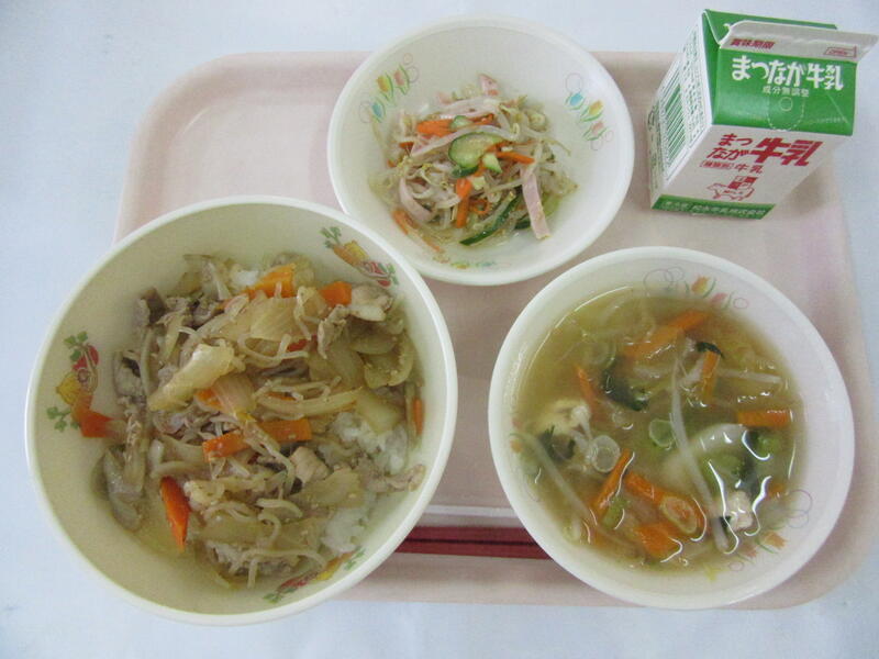 5月30日(火)豚丼、牛乳、ひじきのマリネ、にら玉汁