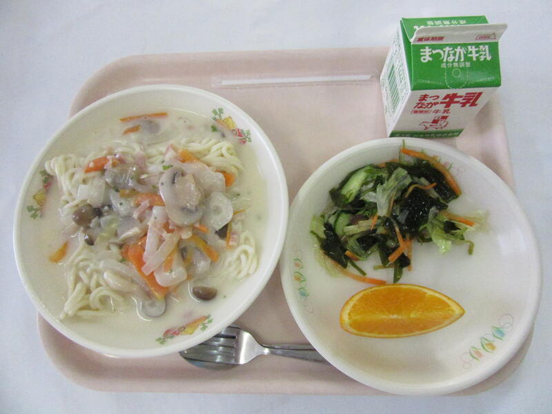クリームスパゲッティー、牛乳、海藻サラダ、オレンジ