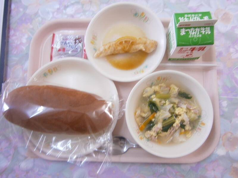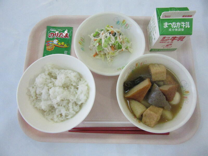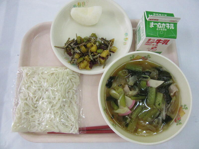 4月12日(水)肉うどん、牛乳、笹かまの磯辺揚げ、ゆかり漬