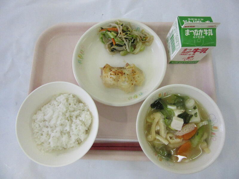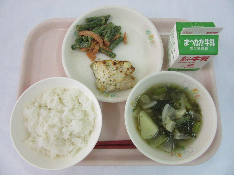 6月12日(月)ごはん、牛乳、スズキのマヨネーズ焼き、いんげんのごま和え、青のりのみそ汁☆学校給食地場産活用状況調査6/12~6/16
