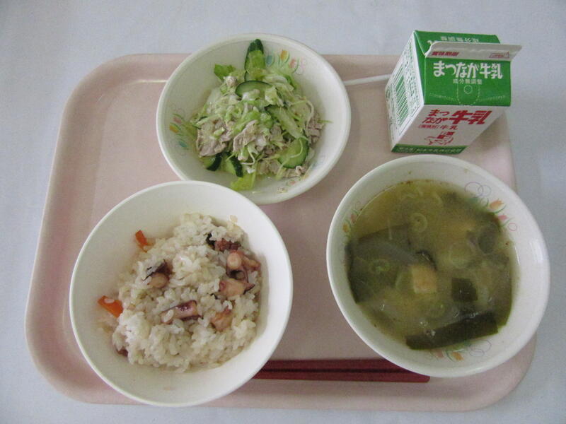 6月13日(火)たこめし、牛乳、豚しゃぶサラダ、じゃがいものみそ汁