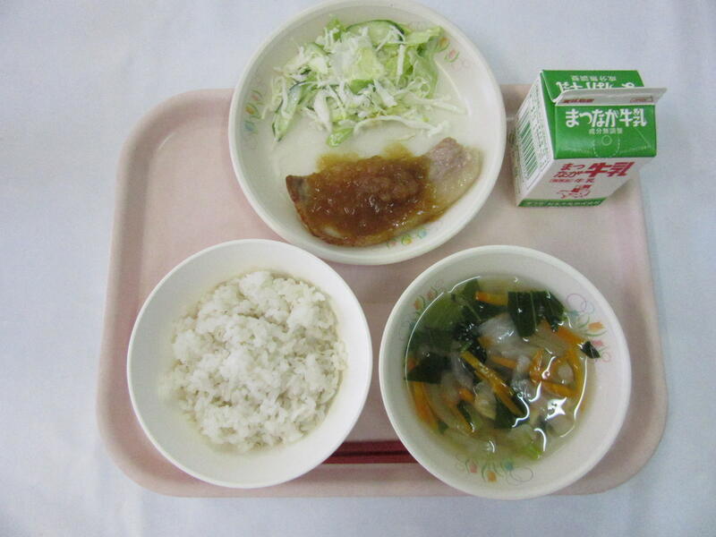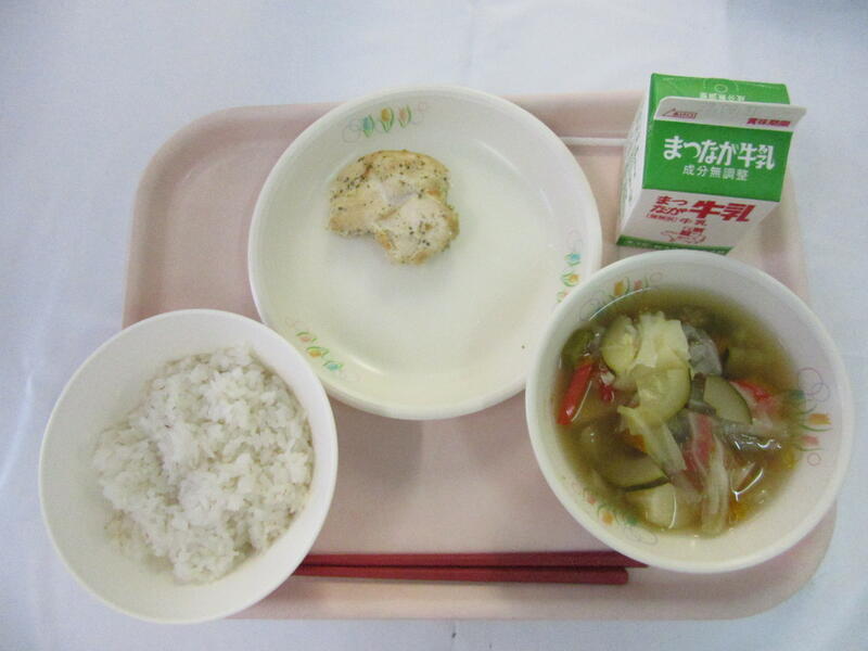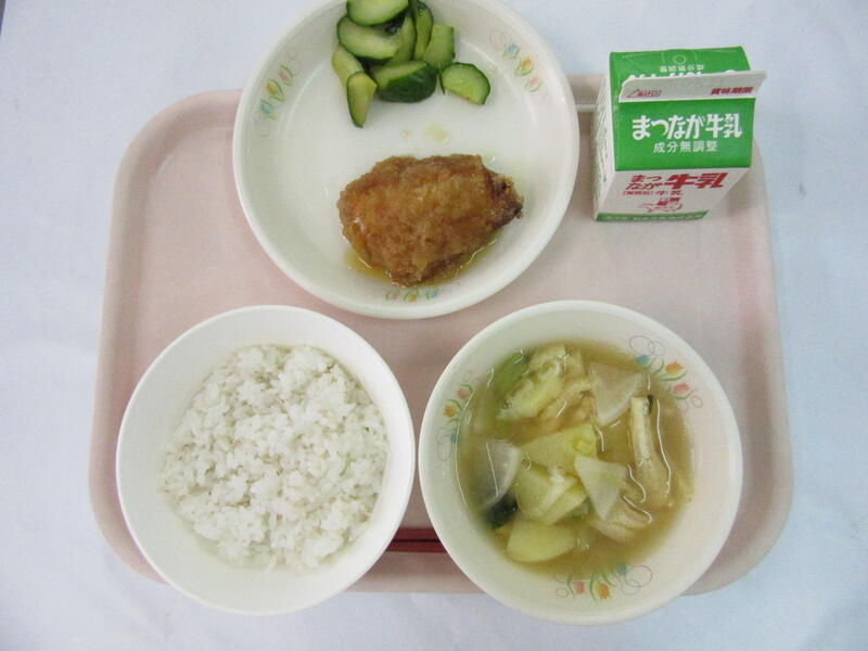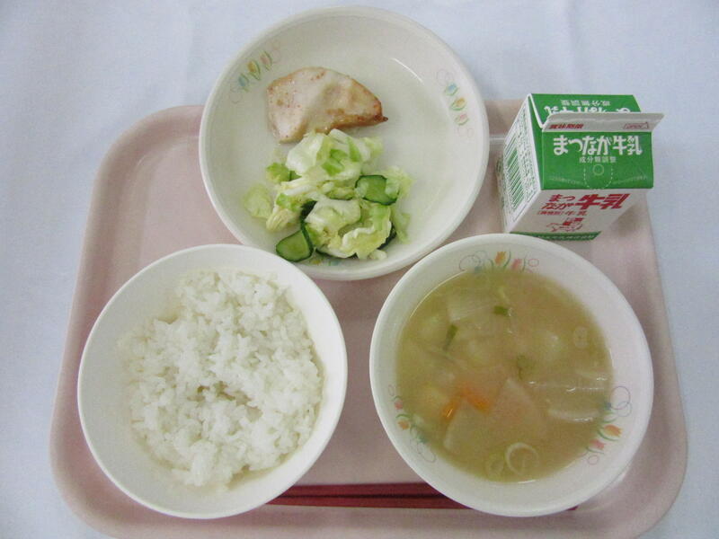 6月16日(金)ごはん、牛乳、鶏肉の香味焼き、キャベツときゅうりの即席漬け、呉汁