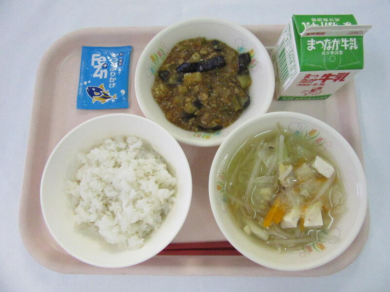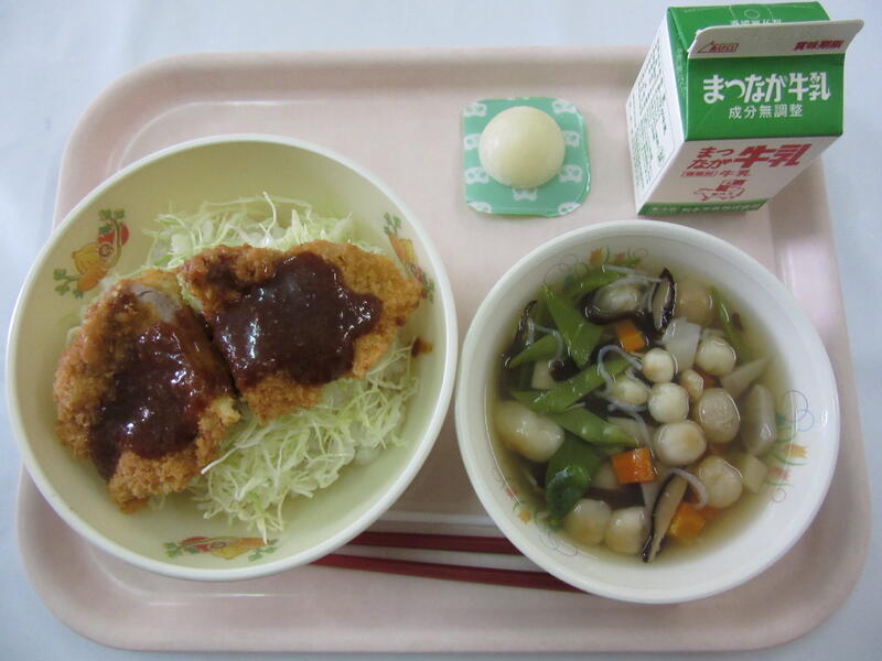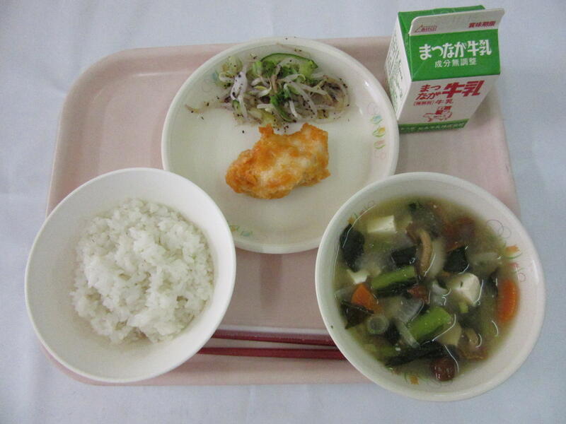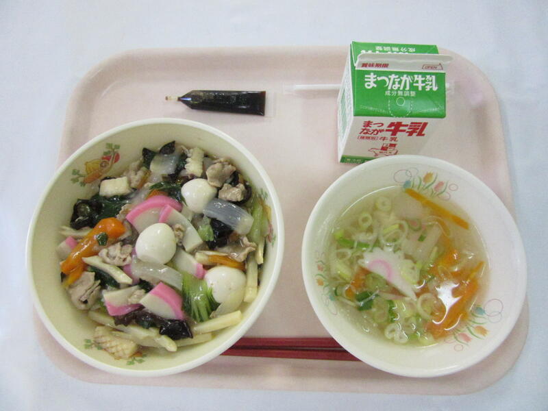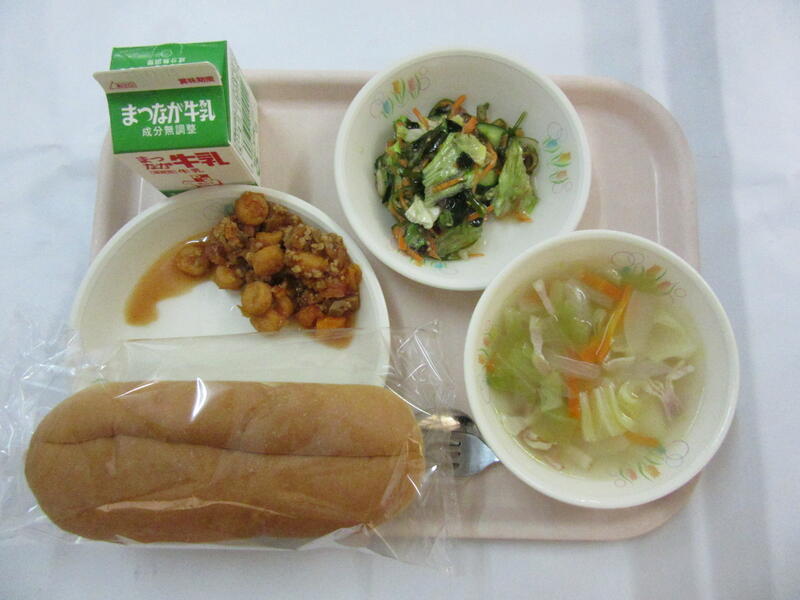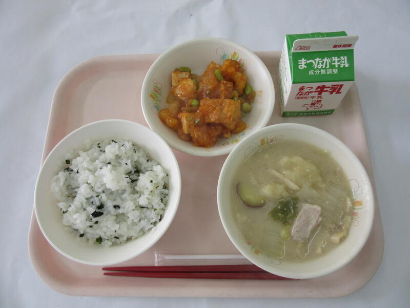 わかめごはん、牛乳、えびといかのチリソース、豆乳入りすいとん汁