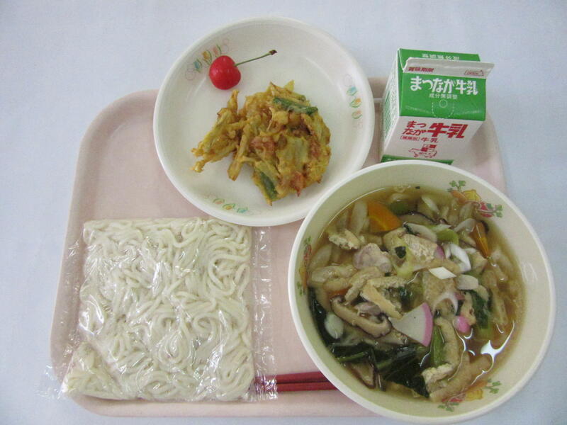 6月21日(水)きつねうどん、牛乳、いんげんのかき揚げ、さくらんぼ