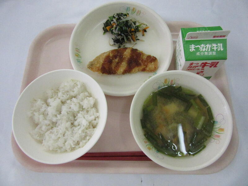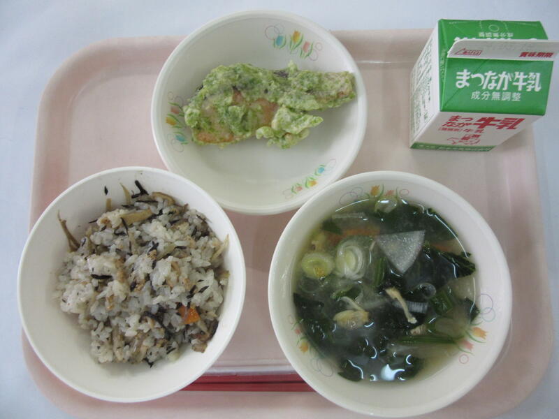 3月12日(火)ひじきごはん、牛乳、鮭の磯辺揚げ、ほうれん草とあさりのみそ汁☆鉄分アップ献立