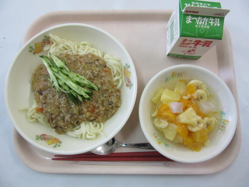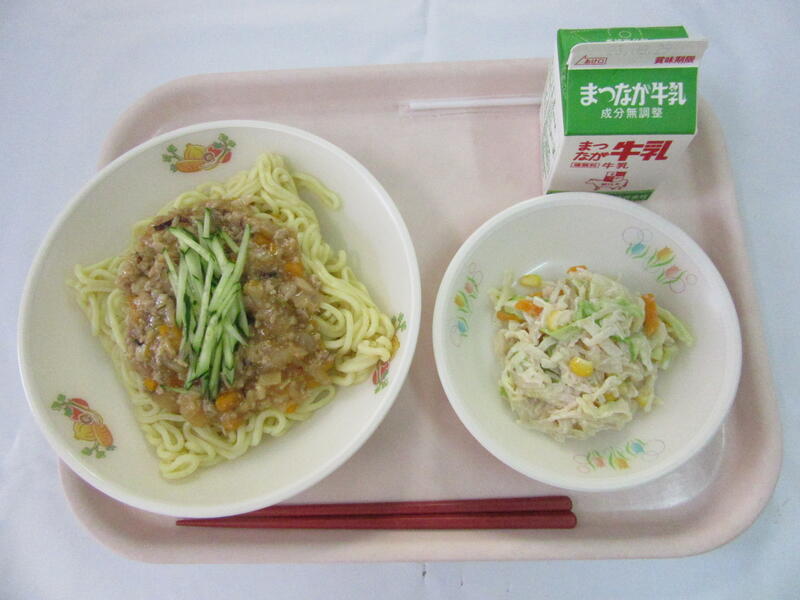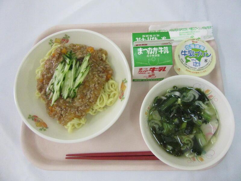 ジャージャー麺、牛乳、わかめスープ、牛乳プリン