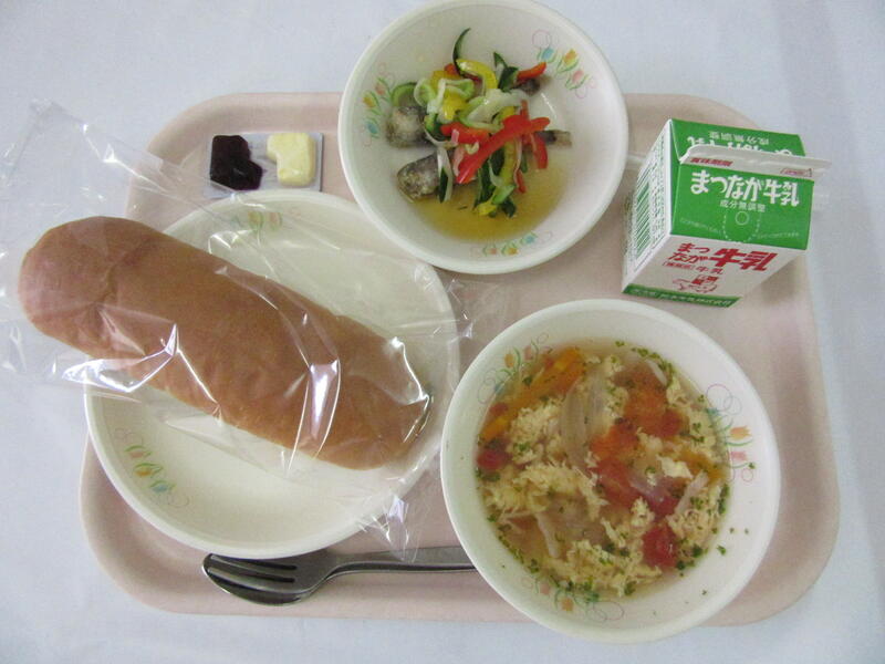 6月8日(木)コッペパン、牛乳、ささみレモンづけ、いちごジャム、卵とキャベツのスープ