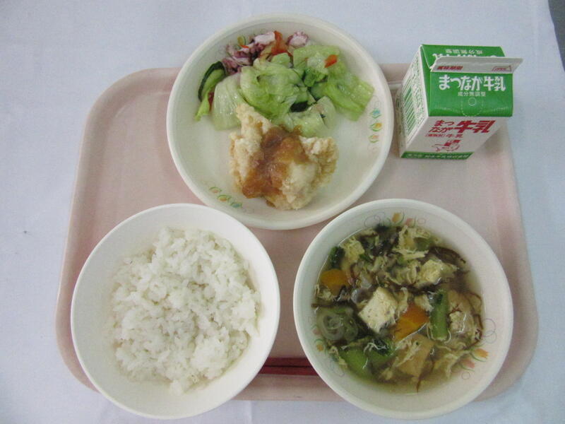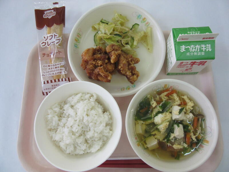 3月15日(金)麦ごはん、牛乳、鶏のからげ、たくわん和え、かき玉汁、チョコクレープ