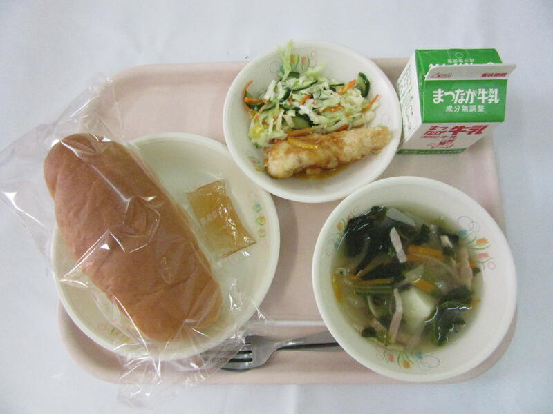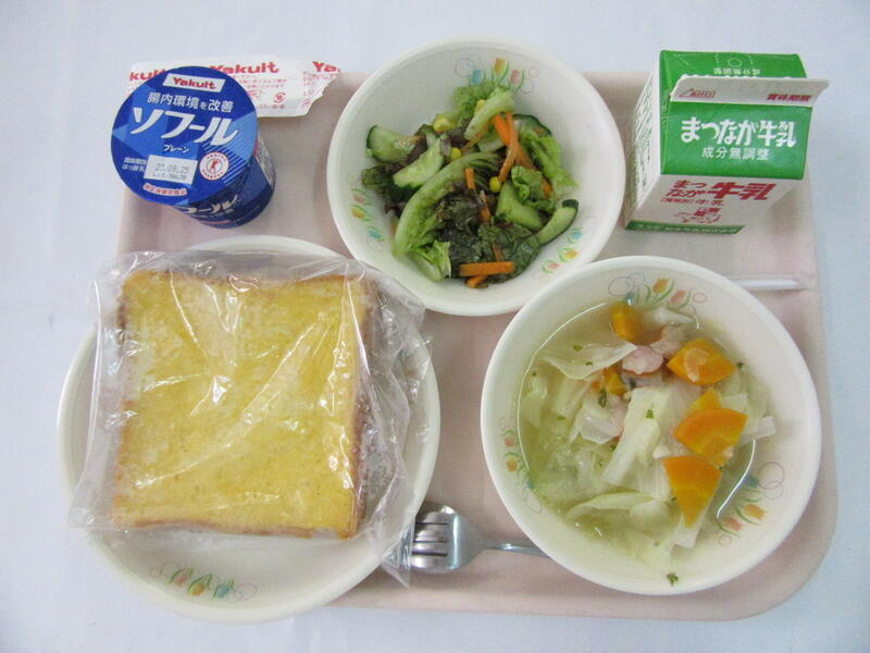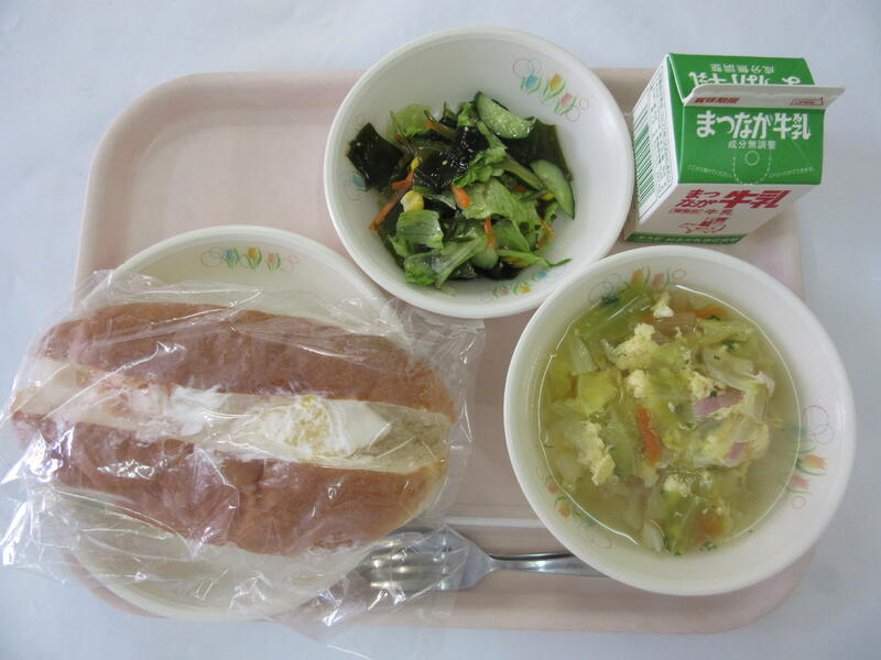 3月7日(木)フルーツホイップサンド、牛乳、海藻サラダ、卵とキャベツのスープ