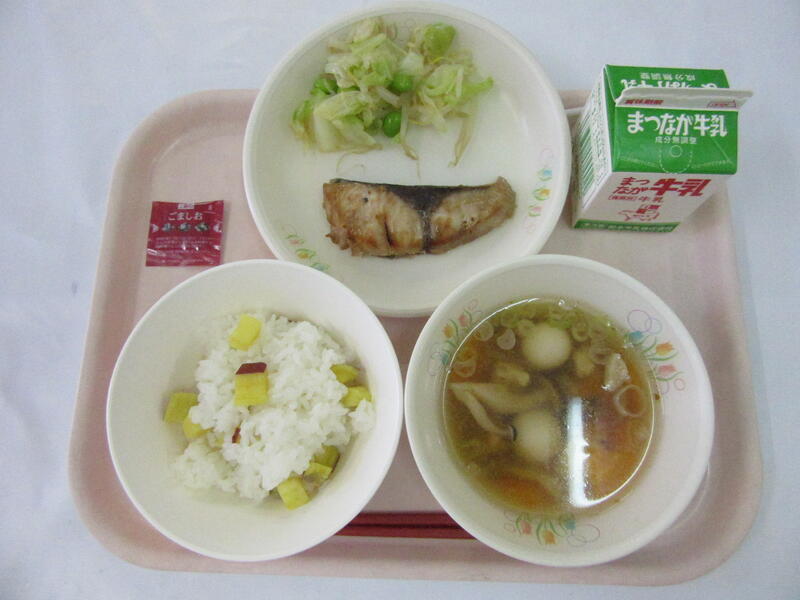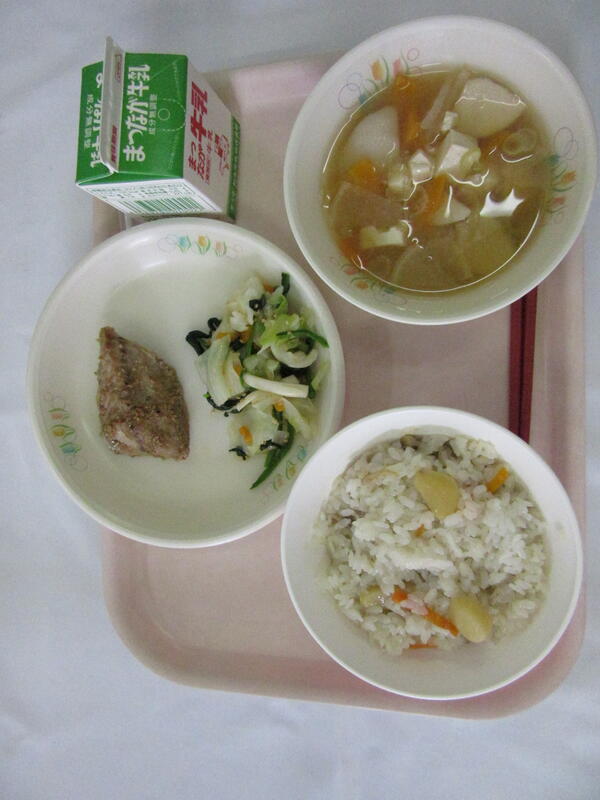 2月19日(月)麦ごはん、牛乳、さばの西京焼き、おかかあえ、いもの子汁