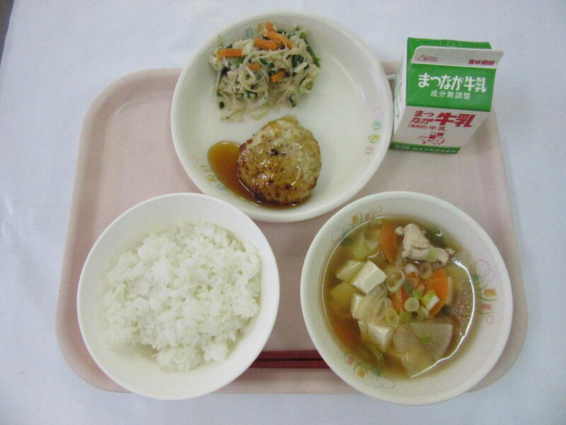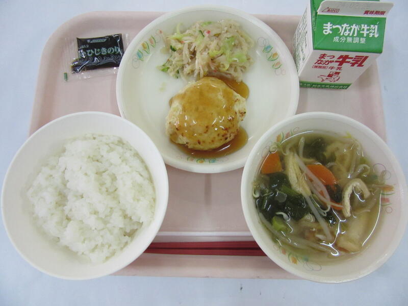 2月20日(火)ごはん、牛乳、鉄っ子ひじき、豆腐ハンバーグ、切り干し大根の和え物、小松菜のみそ汁☆鉄分アップ献立