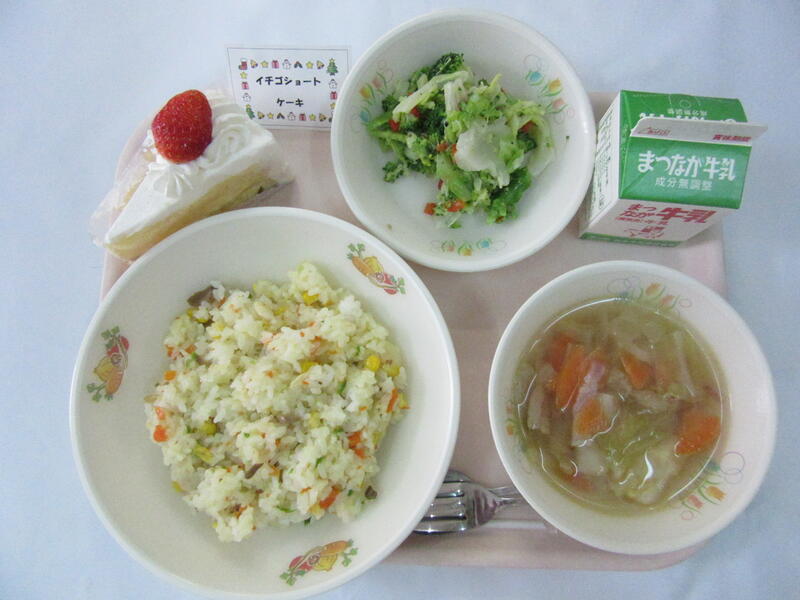 2月13日(火)中華風混ぜごはん、牛乳、春雨スープ、一口いちごゼリー