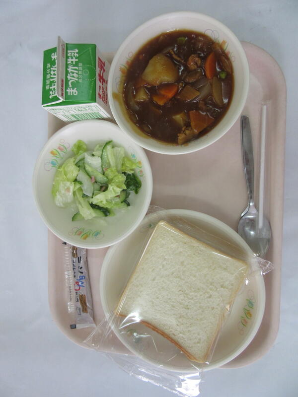 6月15日(金)食パン、県産桃ジャム、トマトとじゃこのサラダ、カレースープ