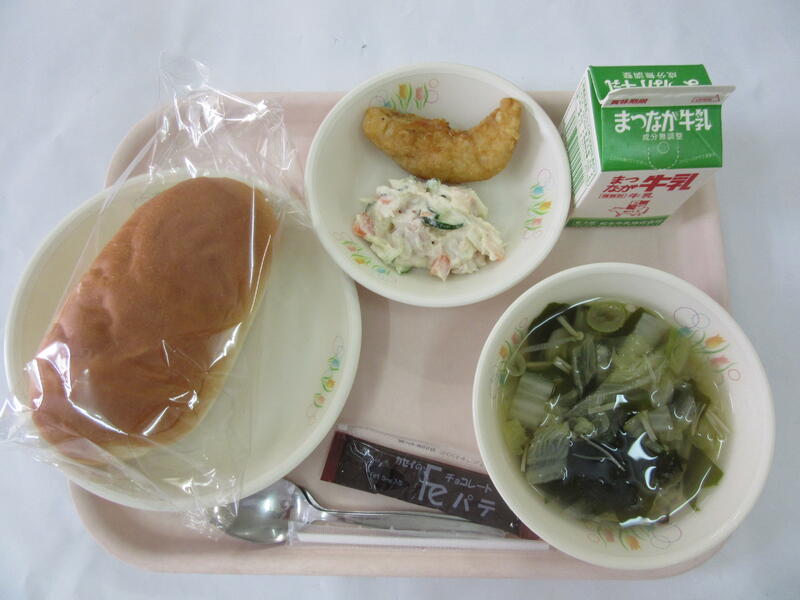 3月14日(木)チョコチップパン、牛乳、グリーンサラダ、アルファベットスープ、ミルメイク、ヨーグルト