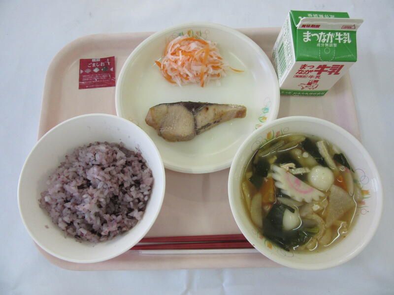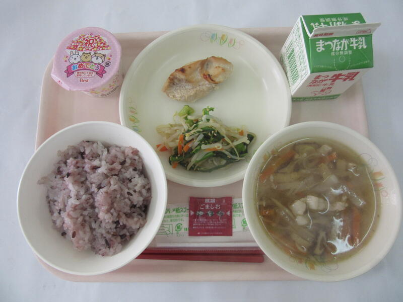 3月8日(金)紫黒米入りごはん、ごま塩、牛乳、菜の花和え、とり肉の照り焼き、沢煮椀、お祝いゼリー☆6年生卒業を祝う献立