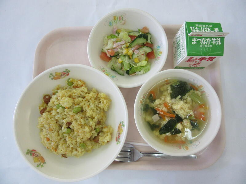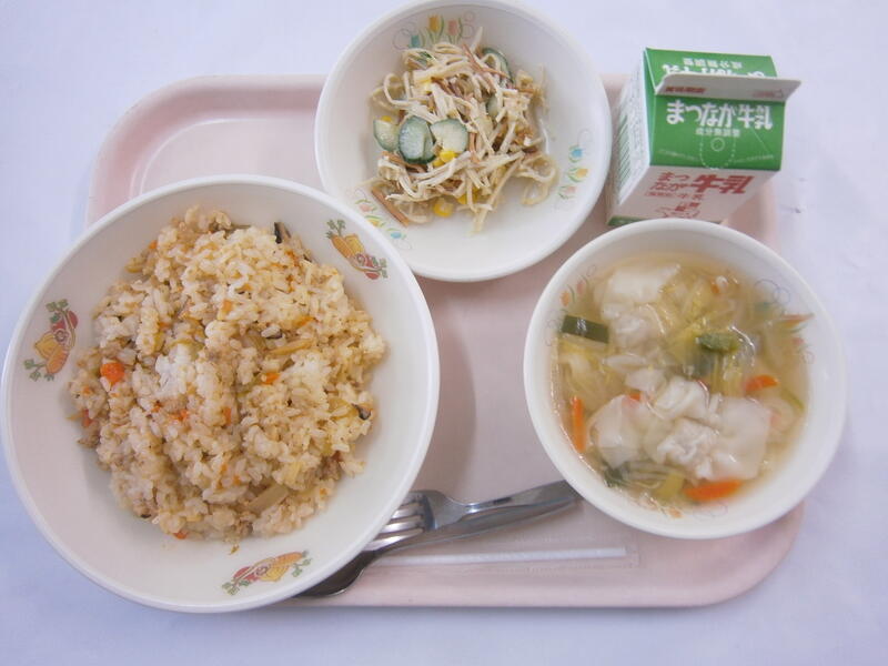 キムチチャーハン、牛乳、かみかみサラダ、ワンタンスープ