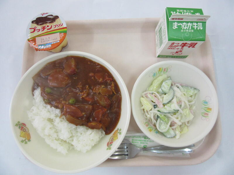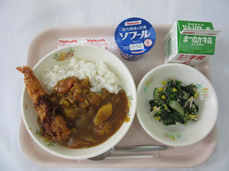 3月4日(月)ポークカレー、牛乳、ポパイサラダ、ヨーグルト、エビフライ☆給食費価格調整でエビフライをつけました。