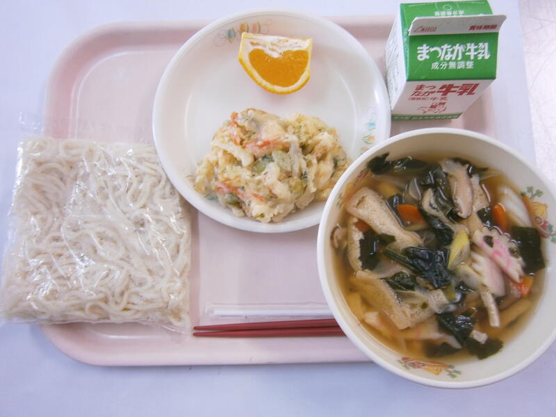 2月28日(水)きつねうどん、牛乳、かきあげ、いよかん