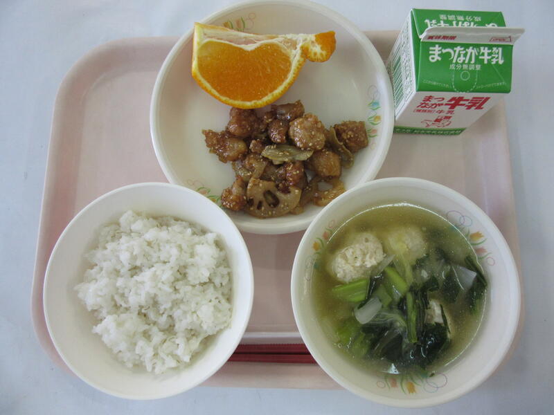 3月11日(月)麦ごはん、牛乳、豚肉のカリン揚げ、白菜と肉団子のスープ、デコポン☆カミングさんまる30献立